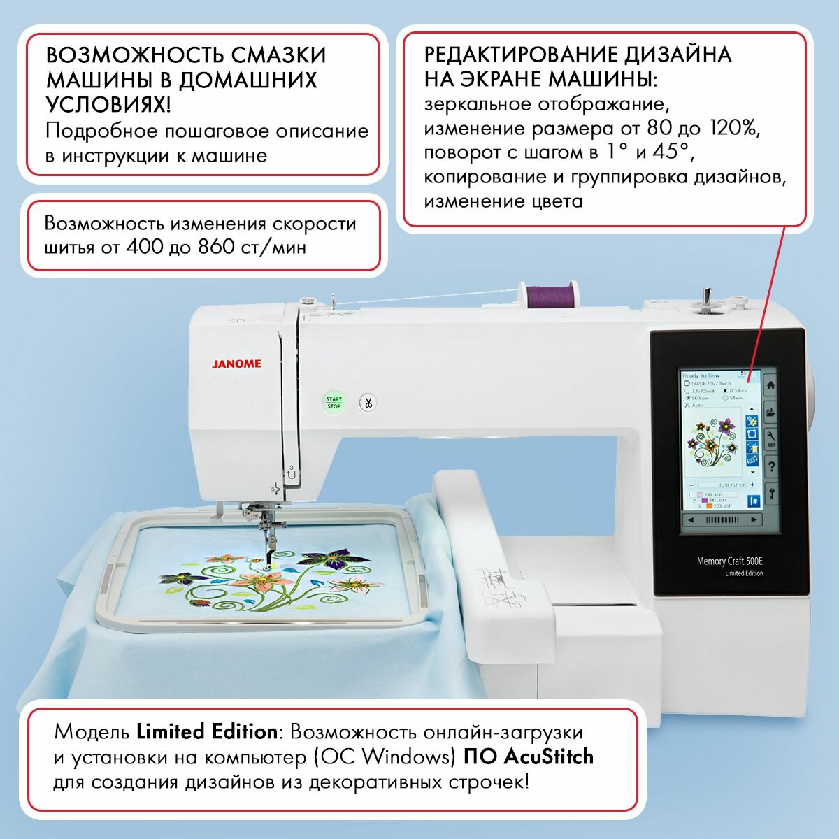 Вышивальная машина Janome Memory Craft 500e Limited Edition (Janome MC 500e) интересное: