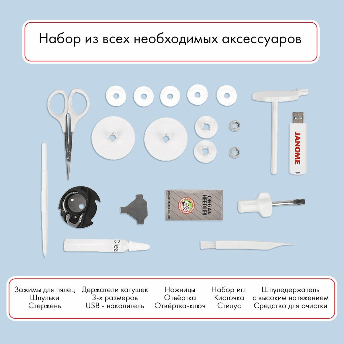 | Особенности | USB-порт / подключение к компьютеру / Дисплей / Подсветка рабочей зоны / Регулировка скорости шитья / Русифицированное меню / Сенсор обрыва нити / Устройство чтения карт памяти |