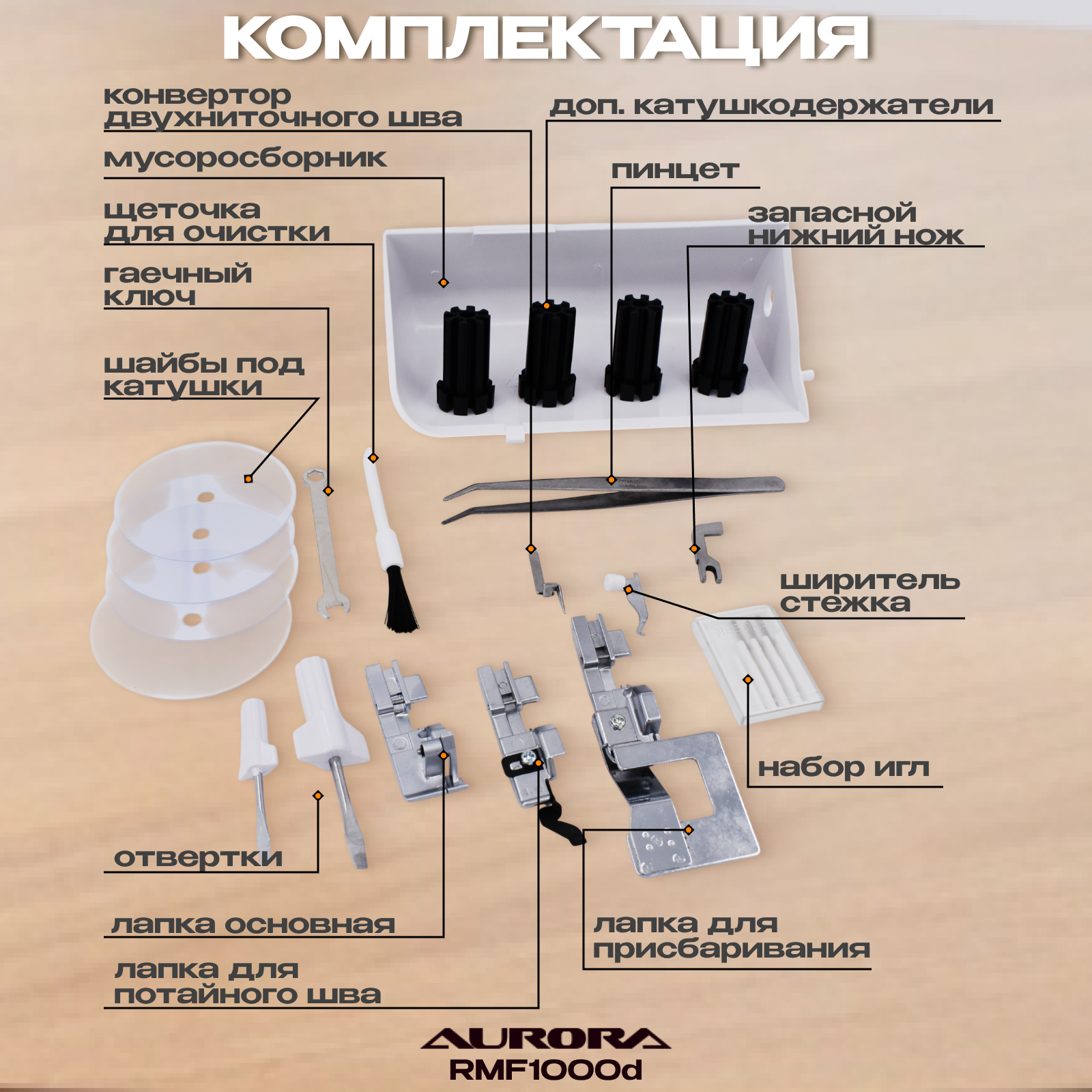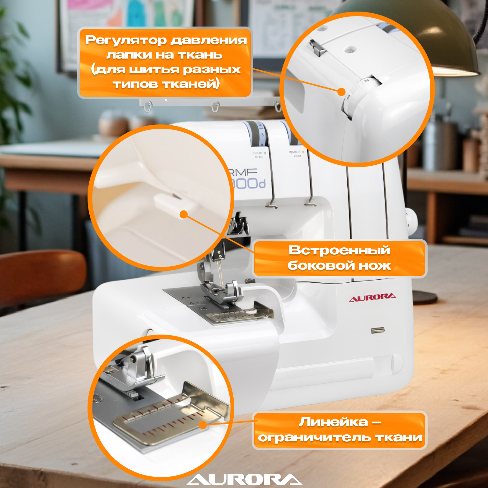 Оверлок Aurora "RMF 1000D", 2-3-4 нити, 12 типов швов, скорость 1300 ст/мин, белый. 3 лапки в комплекте интересное: