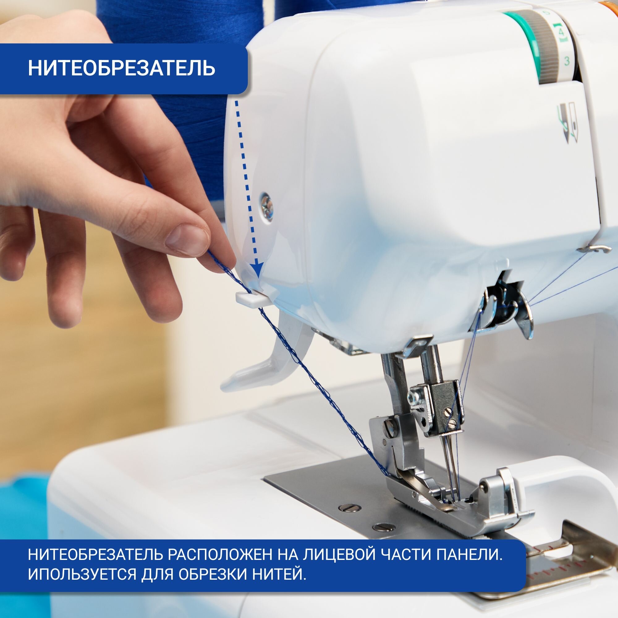 | Особенности | отсек для принадлежностей, Быстросъемная лапка, Вертикальный катушечный стержень, Дополнительный подъём лапки, Заправщик нижнего петлителя, Лоток для сбора обрезков |