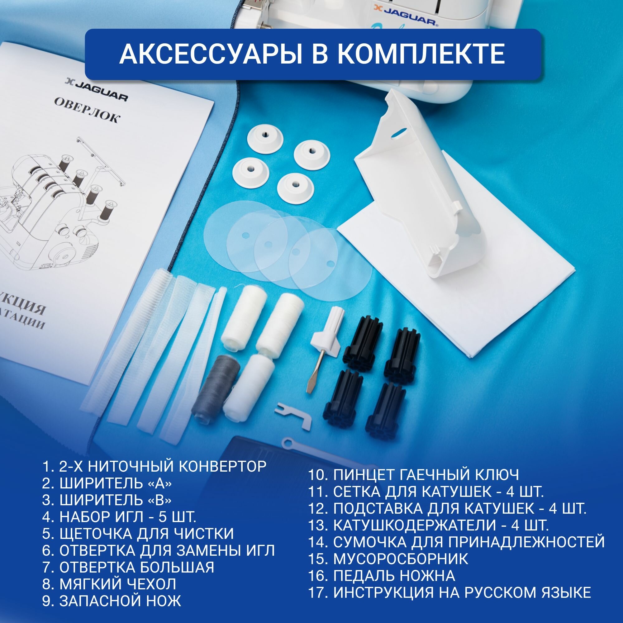 | Комплектация | Подставки для катушек Сетки для катушек Катушкодержатели Конвертор для 2-х ниточного шва Стежковый язычок (В) Подвижный нож Пинцет Гаечный ключ Отвёртка большая Отвёртка малая Набор игл (зависит от поставки) Щёточка для чистки (зависит от поставки) Сумочка для принадлежностей Мусоросборник Мягкий чехол Инструкция по эксплуатации Ножная педаль |