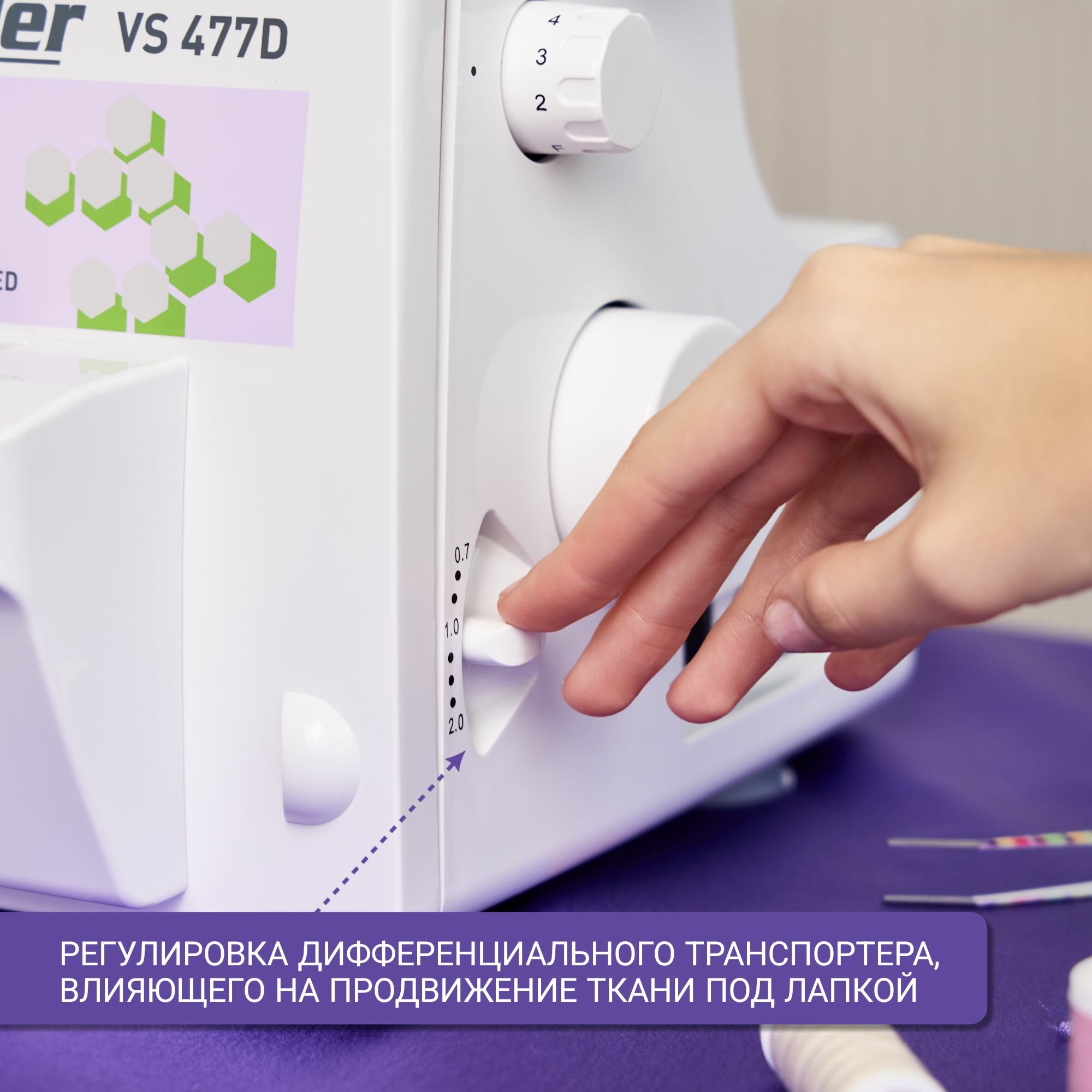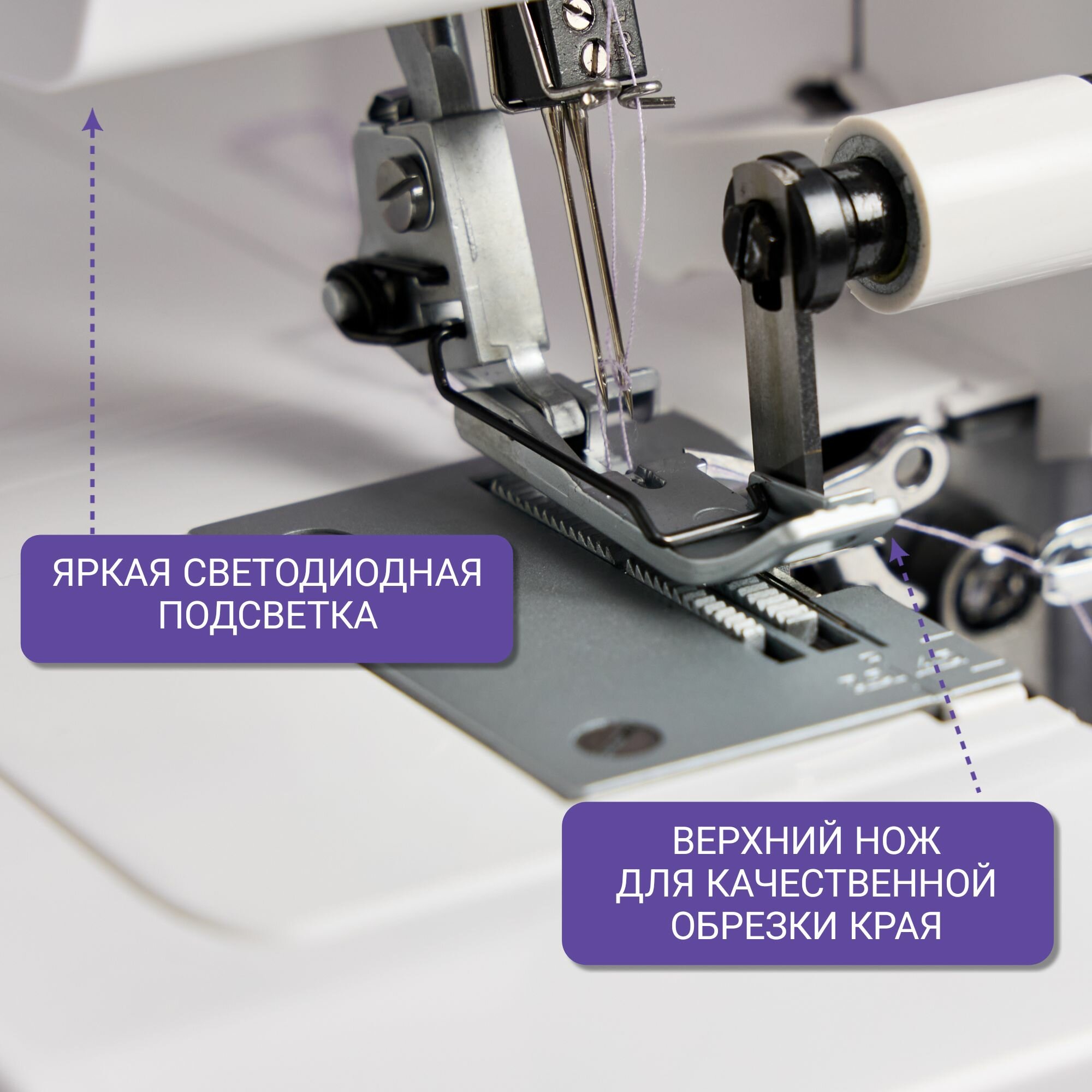 | Дополнительные функции | стабилизатор силы прокола, Дифференциальная подача материала, Отключаемый нож, Подсветка рабочей зоны, Регулировка скорости шитья, Регулятор давления лапки на ткань, Регулятор длины стежка, Русифицированное меню, Шитье двойной иглой |
