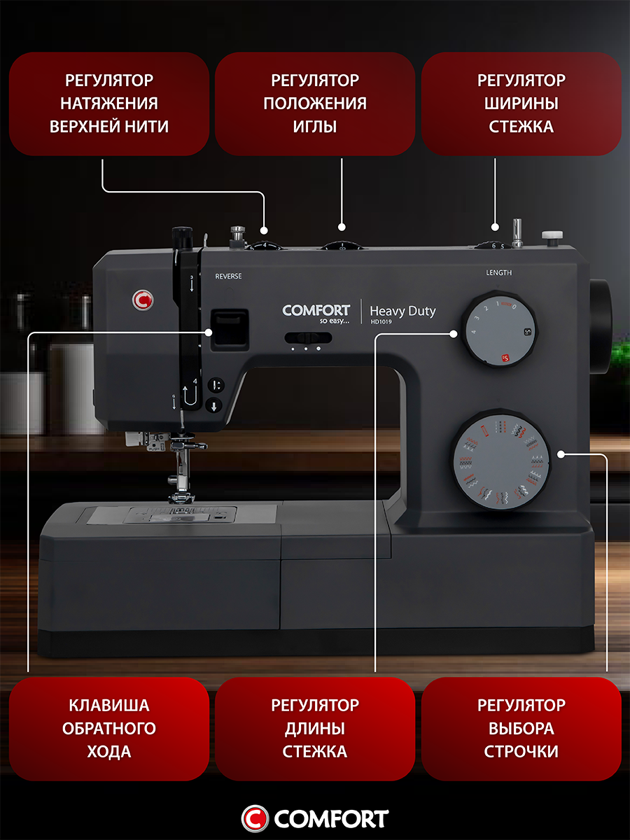 Швейная машина Comfort HD1019, 34 операции, нитевдеватель, электронный блок, доп. столик интересное: