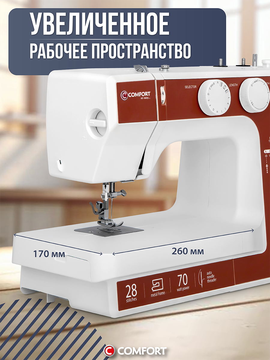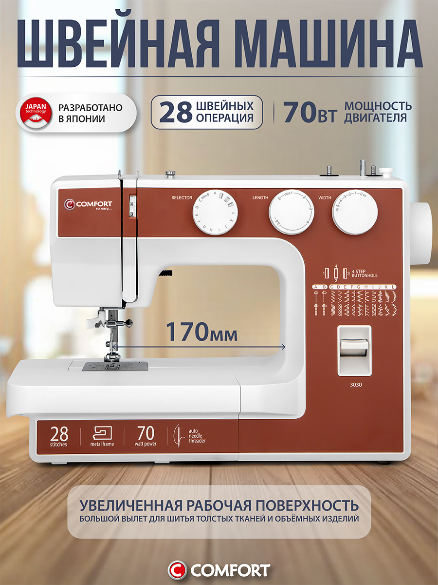 Швейная машина Comfort 3030, 28 операций, петля полуавтомат, нитевдеватель, регулятор давления лапки на ткань интересное: