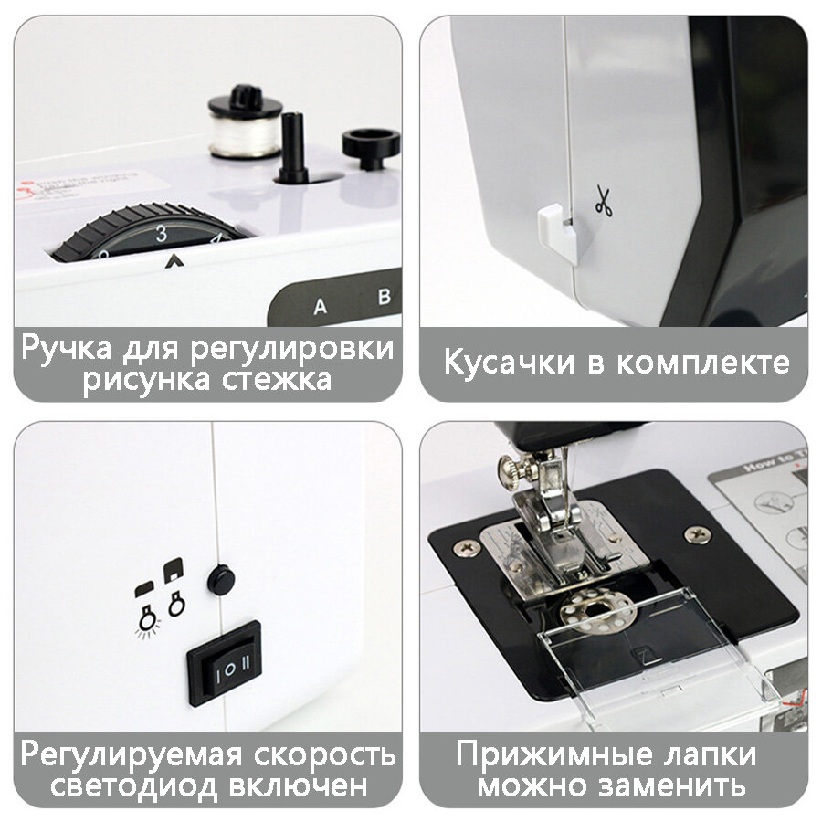 | Дополнительные функции | автоматическое закрепление строчки, верхний транспортер ткани, кнопка реверса, переключатель положения иглы (верх/низ), регулировка давления лапки на ткань, шитье без педали, электронный стабилизатор усилия прокола |