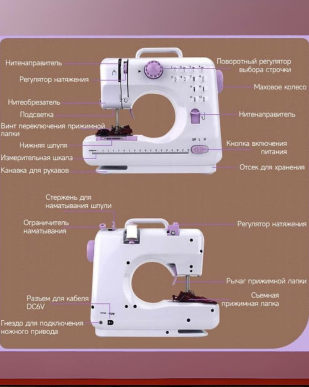 | Подробная комплектация | швейная машинка-1 шт. шпуля большая-2 шт. шпуля малая-1 шт. нитевдеватель-1 шт. игла-1 шт. ножной привод-1 шт. сетевой адаптер-1 шт. набор аксессуаров-1 шт. инструкция-1 шт. распарыватель1 шт. ножницы-1 шт. |