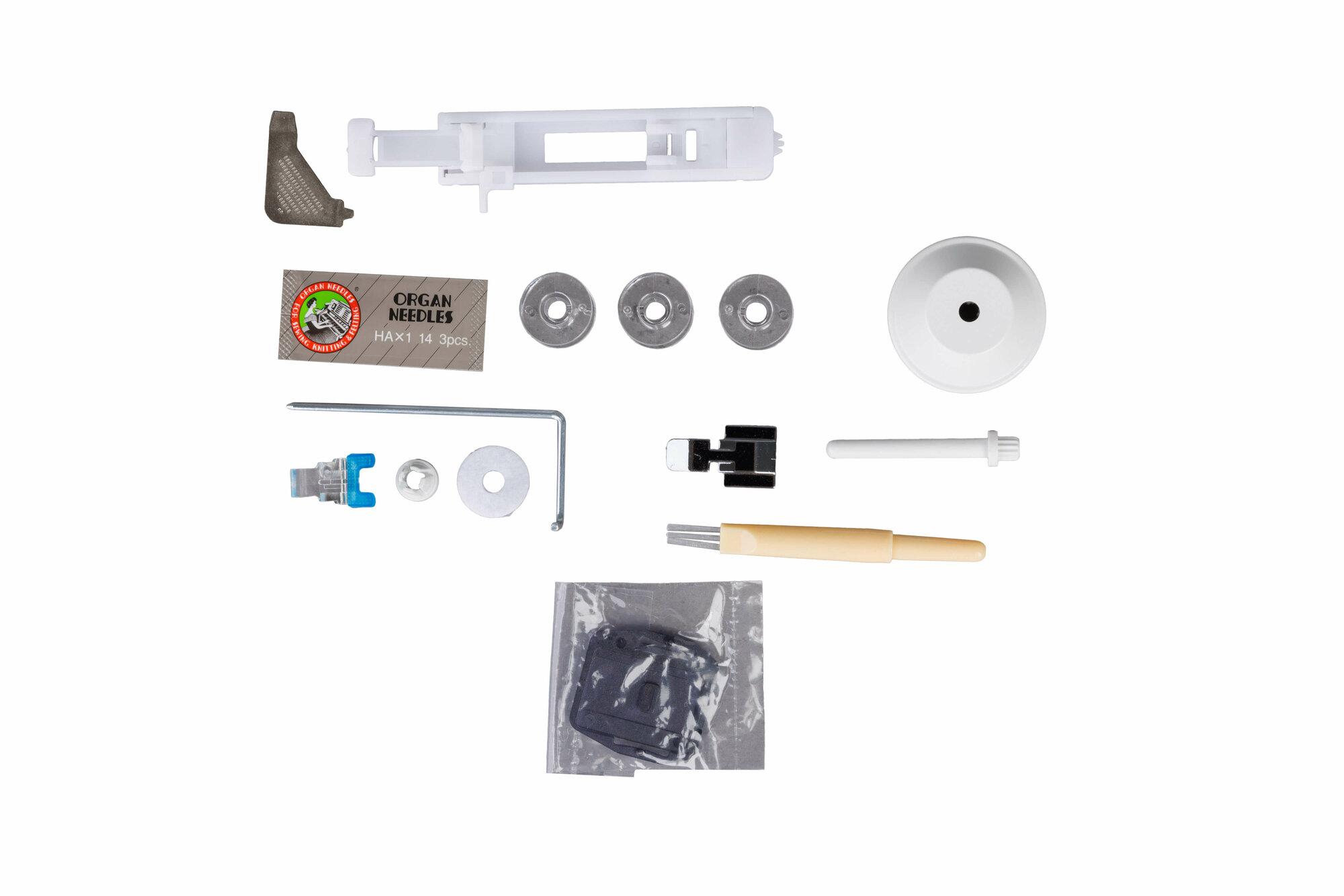 | Подробная комплектация | Лапка универсальная (установлена на машине), Лапка для пришивания пуговиц, Лапка для автоматического выметывания петли, Лапка для вшивания молнии, Лапка для потайной молнии, Шпульки (3 шт), Набор игл, Большой и малый ограничители катушки, Держатель катушки, Л-образная отвертка, Маслёнка, Вспарыватель/щётка для чистки, Фетровая прокладка (2 шт.), Пластина для штопки, Направляющая для выстегивания, Ножная педаль, Инструкция по эксплуатации, Мягкий чехол |