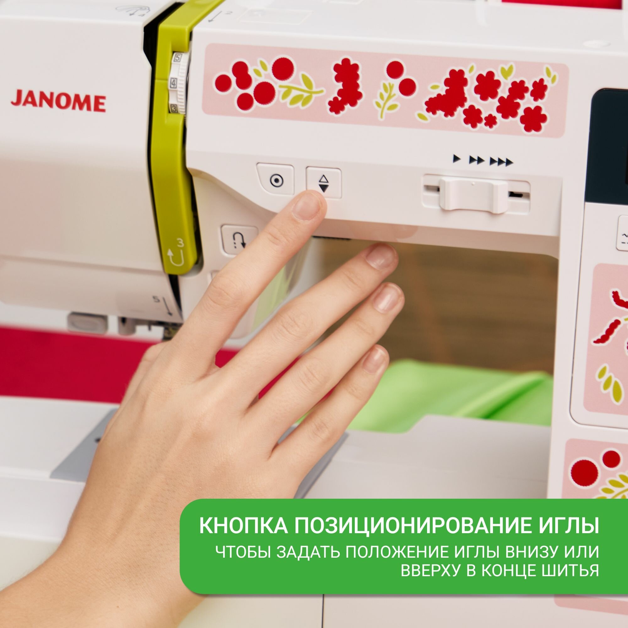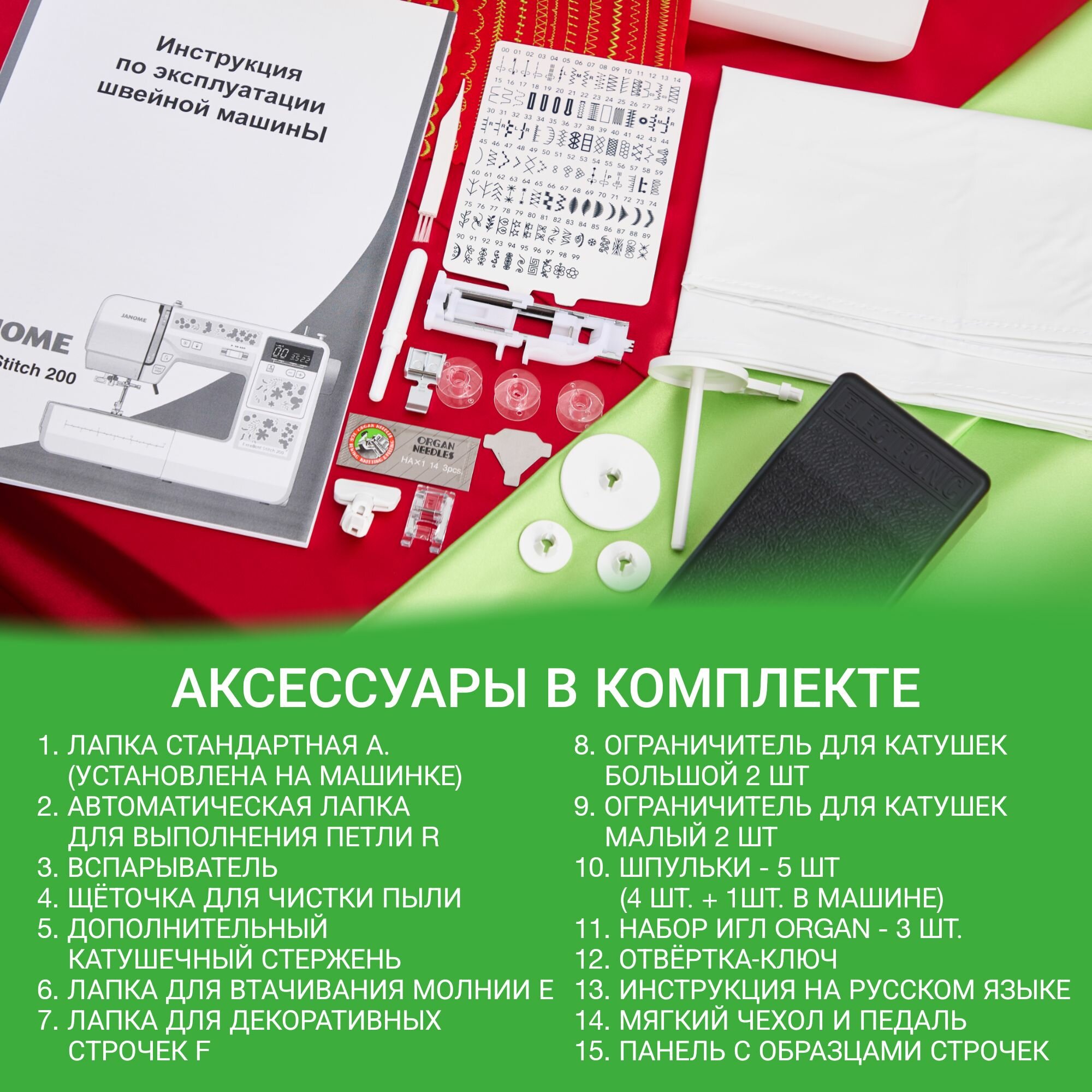 | Функциональные особенности швейного оборудования | Автоматическая закрепка, Дисплей, Кнопка позиционирования иглы, Линейка на корпусе, Подключение к компьютеру, Подсветка рабочей зоны, Реверс, Регулировка скорости шитья, Регулятор давления лапки на ткань, Регулятор длины стежка, Русифицированное меню, Стабилизатор силы прокола, Шитье двойной иглой |