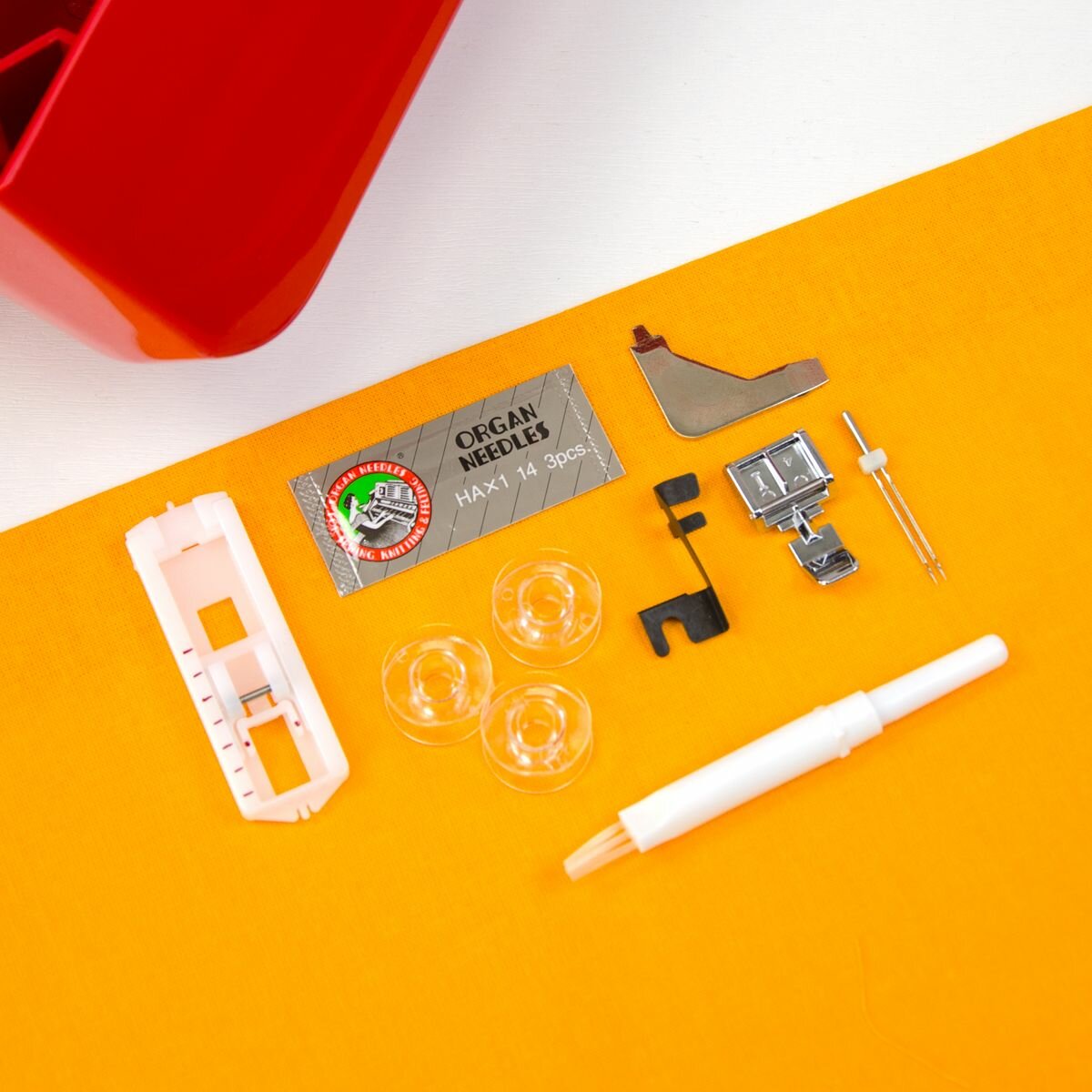 | Комплектация | 1. Шпульки (3 шт.) 2. Набор игл - 3 шт.; двойная игла - 1 шт. 3. Многофункциональная отвертка 4. Распарыватель со щеточкой 5. Лапка для петель 6. Направляющая насадка 7. Лапка для молний 8. Педаль с вилкой питания для плавной регулировки скорости шитья, предустановленная универсальная лапка, инструкция по эксплуатации и гарантийный талон. |