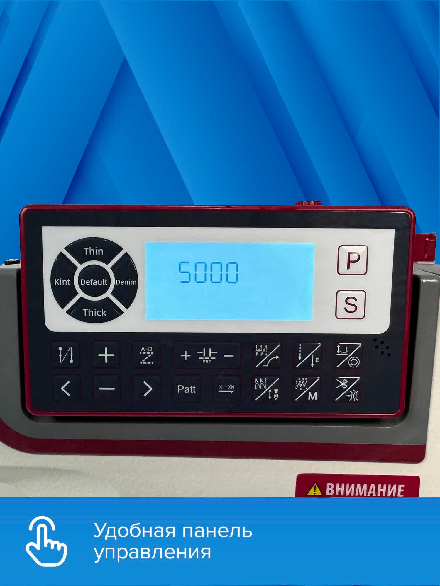 | Функциональные особенности швейного оборудования | Автоматическая закрепка, Дисплей, Кнопка позиционирования иглы, Линейка на корпусе, Подсветка рабочей зоны |