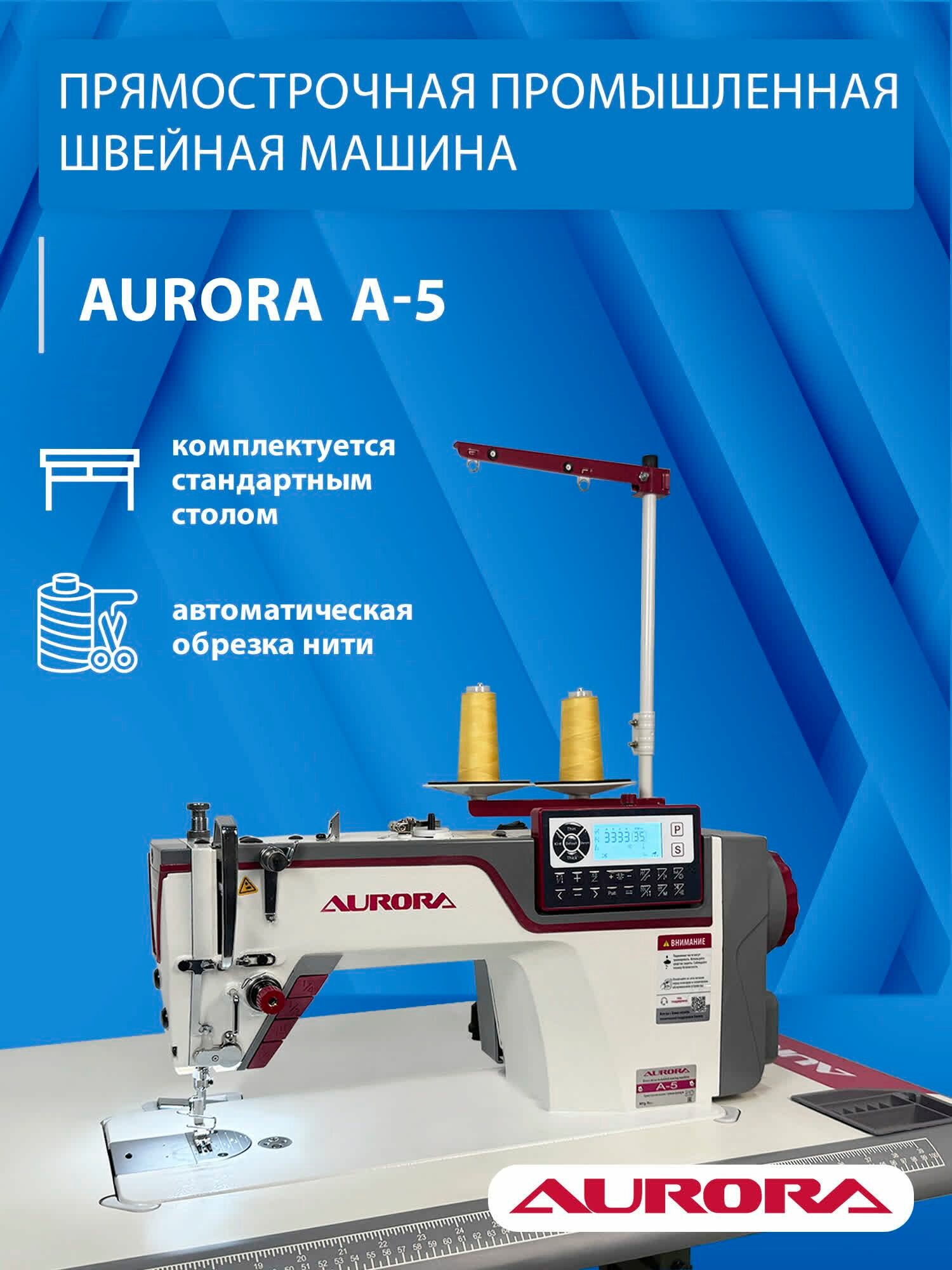 | Комплектация | швейная голова Aurora A-5, стандартный стол Aurora, ЗИП-пакет, руководство пользователя |