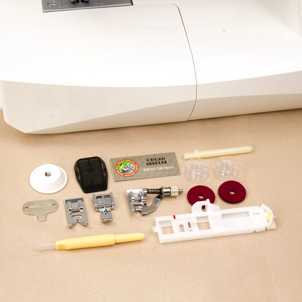 | Подробная комплектация | Лапка универсальная, лапка для пришивания молнии, лапка с ограничителем, лапка для автоматической петли, три шпули, щётка-вспарыватель, набор игл, пластина для штопки, дополнительный катушкодержатель, приставной столик. |