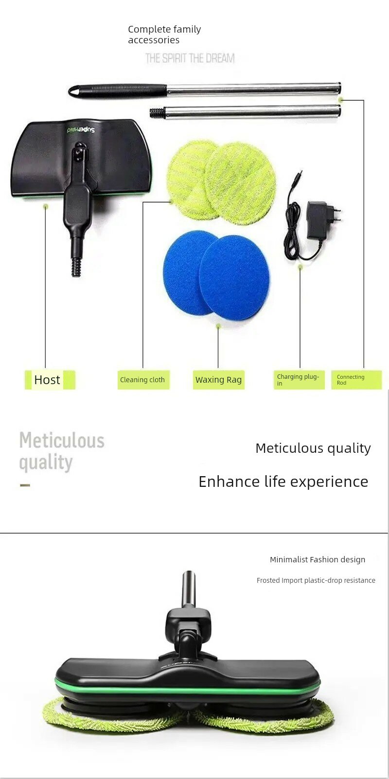 | Дополнительная информация | беспроводная работа, очистка и полировка, работа одной рукой, быстрая полировка, полировка и придание блеска, литиевая батарея большой емкости, автоматическая смена швабры, регулируемое телескопическое вращение (под давлением) для мытья пола |