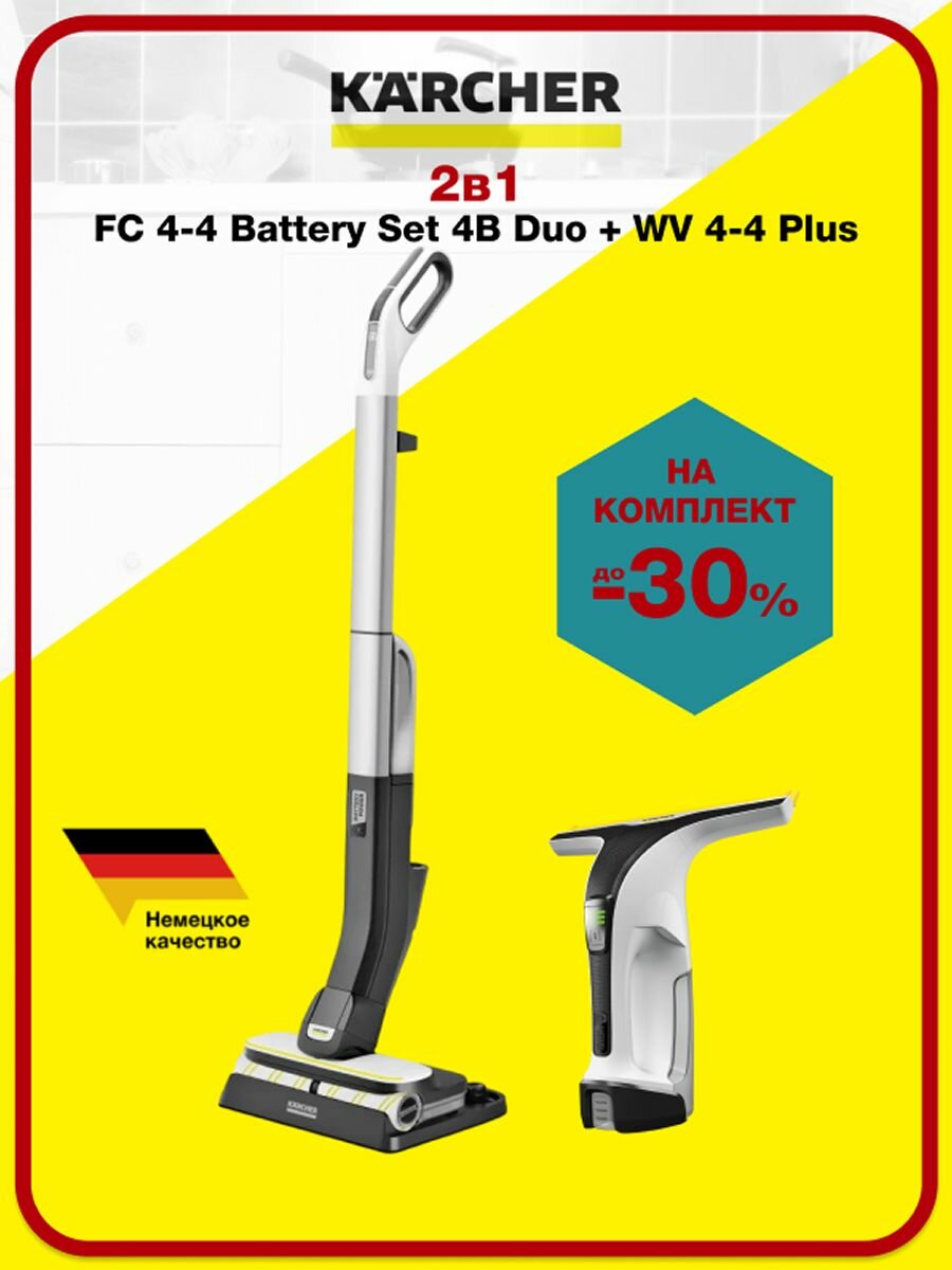 Комплект Karcher Электрошвабра FC 4-4 Battery Set 4B Duo (1.056-406.0) и стеклоочиститель WV 4-4 PLUS (1.633-540.0) мощный аккумулятор интересное: