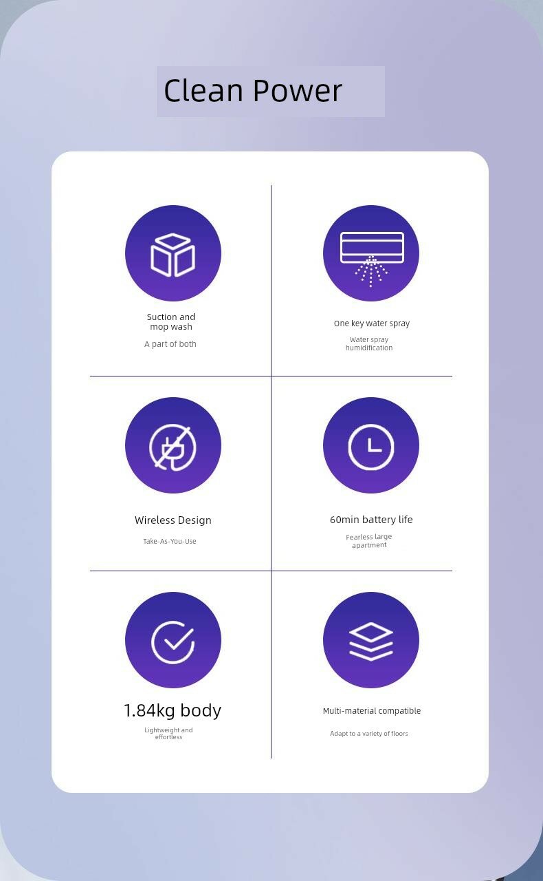 | Дополнительная информация | беспроводной, стерилизация, интеллектуальная мойка, всасывание, объединение мытья и протирания, ультрафиолетовая стерилизация, очистка одним ключом, распыление увлажнения, мытье без помощи рук, подметание и перетаскивание все в одном, адаптация к различным типам полов, пылесборник большой емкости, эффективное ведро для очистки, распыление воды одним ключом, 60 минут автономной работы, легкий, сухое и влажное всестороннее удаление, степень стерилизации 99,99%, подходящее ведро для очистки, автоматическая очистка ключом, контролируемая влажность сушки швабры |