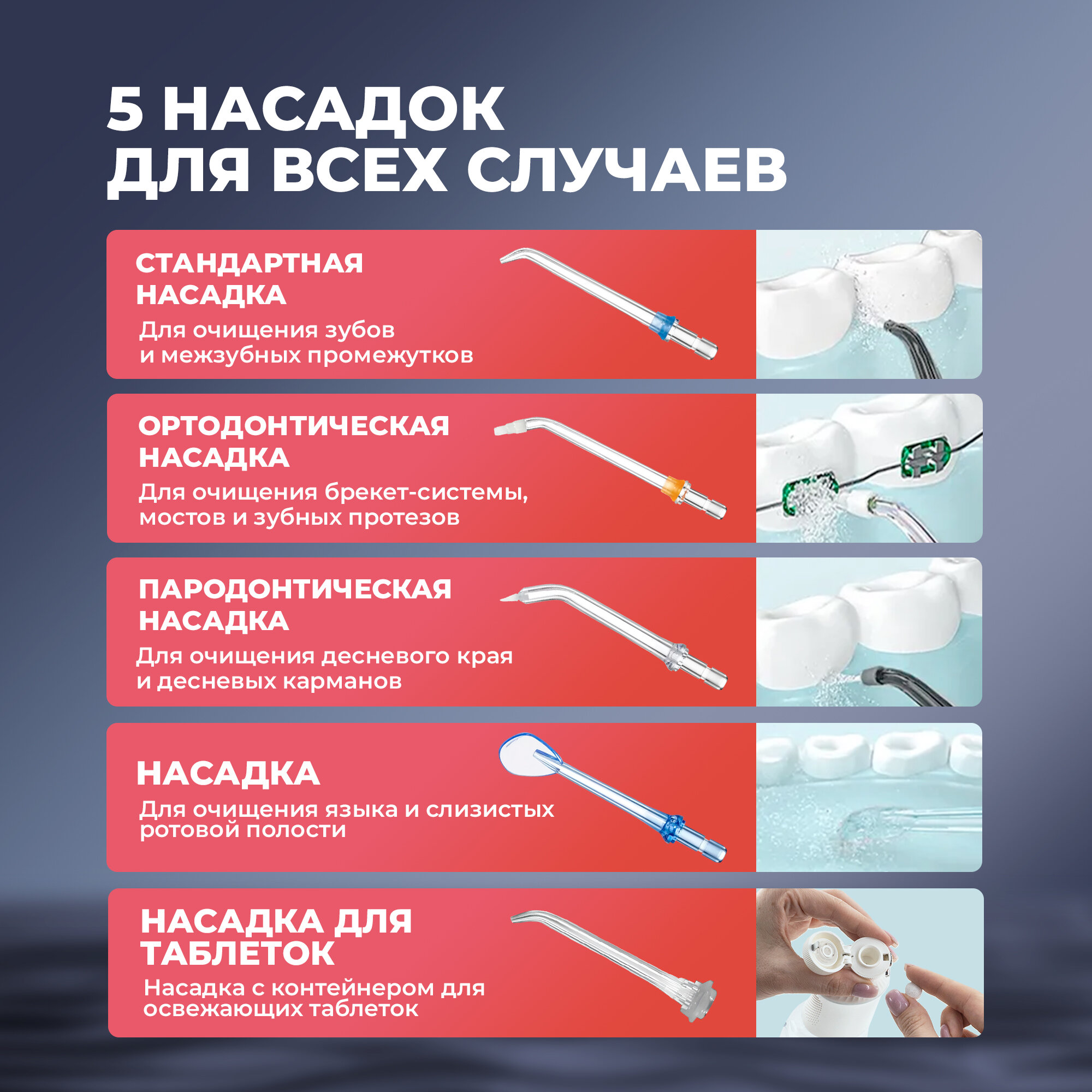 | Тип насадки | для ежедневной чистки / для чистки языка / ортодонтическая / пародонтическая насадка / для освежающих таблеток |