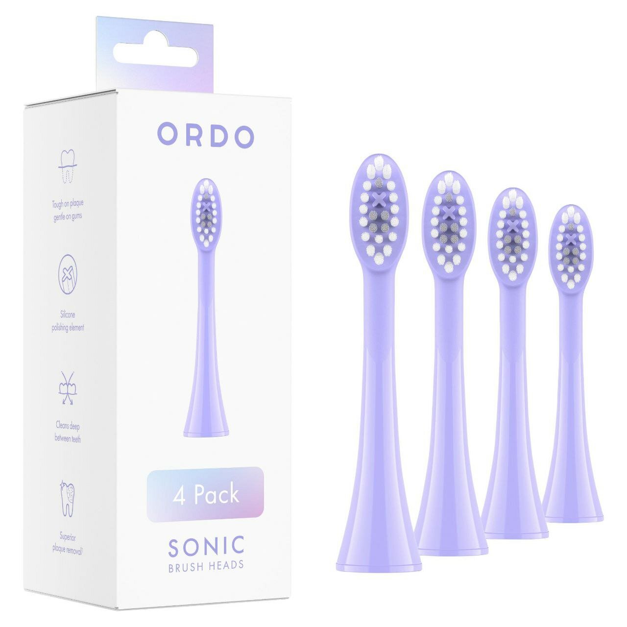 Купить Сменные насадки для электрической зубной щетки ORDO Sonic+ с закругленными щетинками и силиконовым полирующим элементом, 4 штуки, фиолетовые