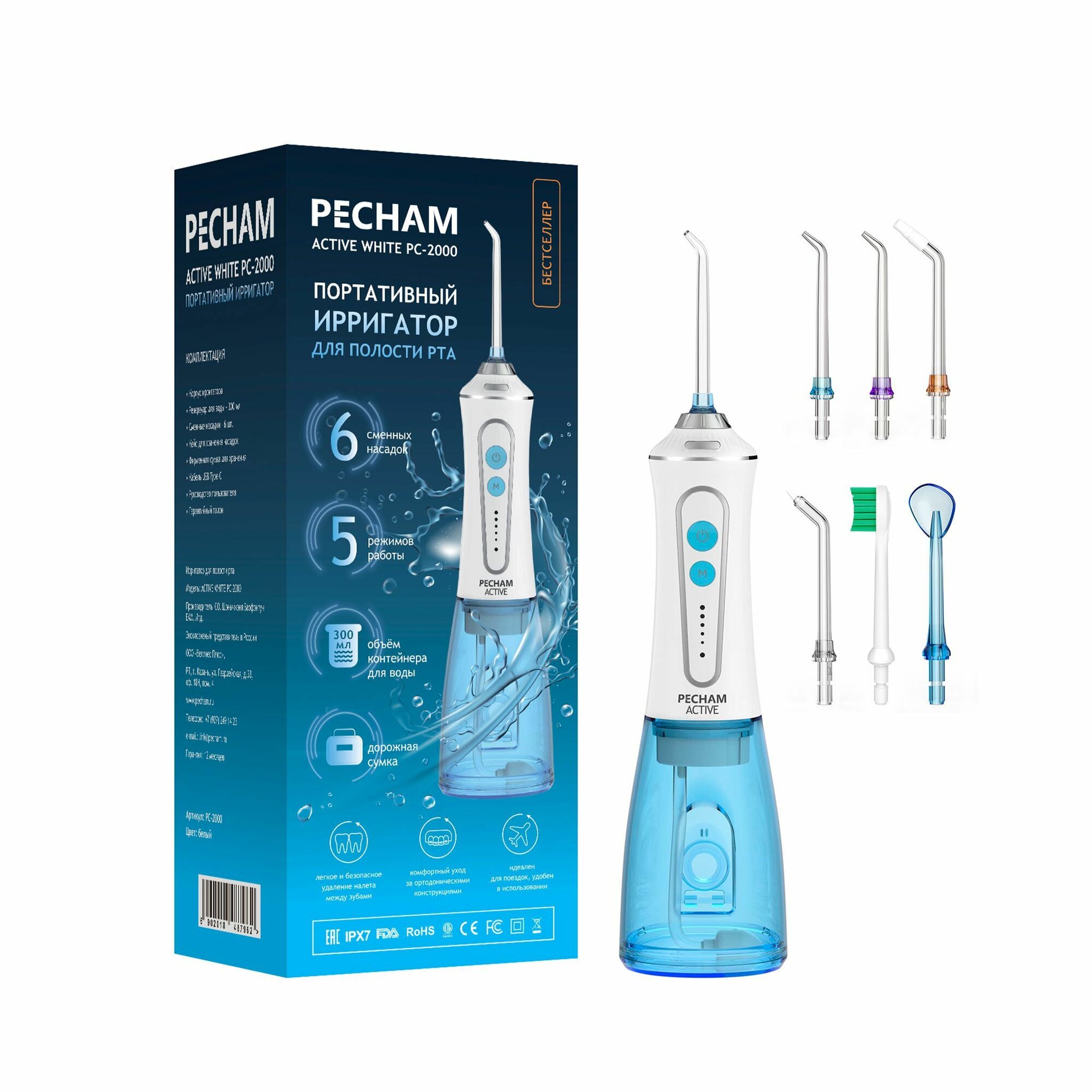 Купить Ирригатор для полости рта портативный PECHAM Active White, 5 режимов, с чехлом, беспроводной, медицинский, насадки, компактный
