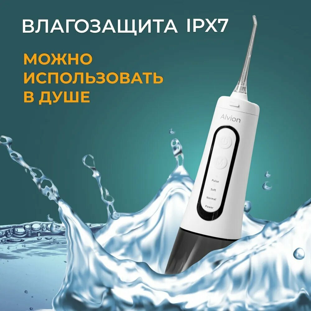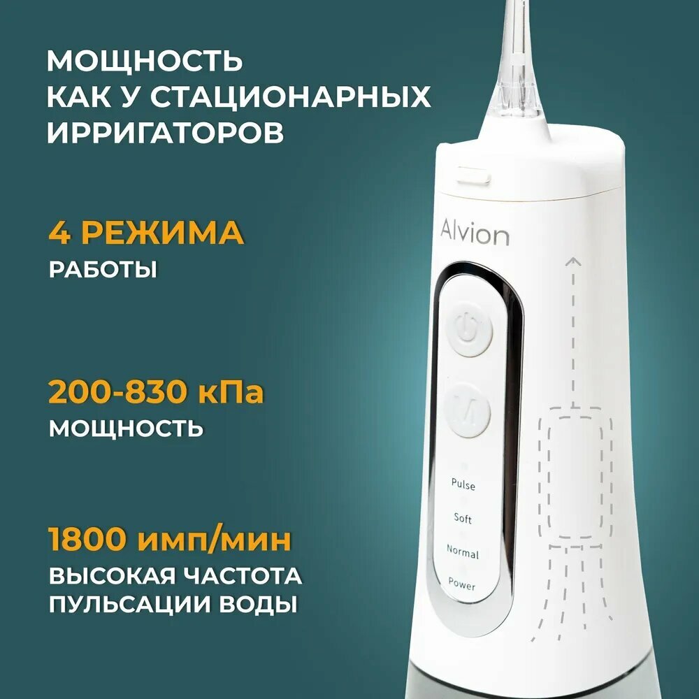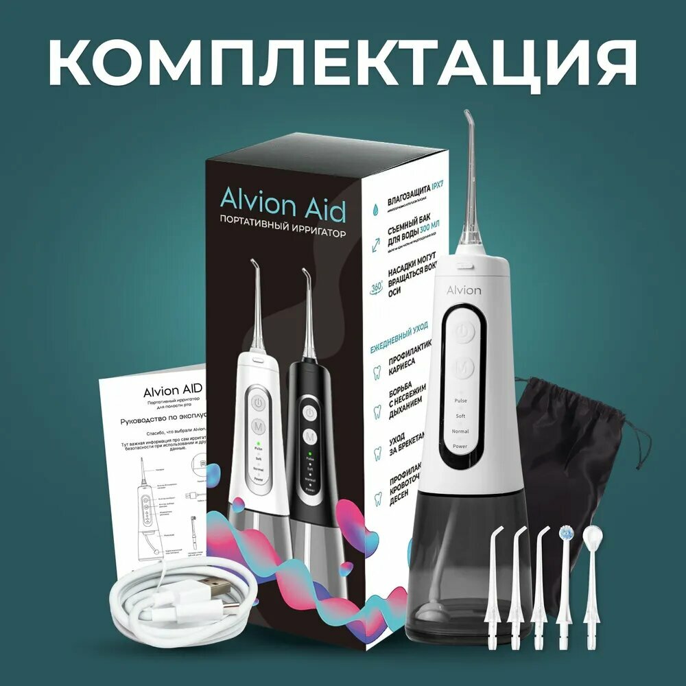 Ирригатор для полости рта портативный с насадками Alvion Aid, беспроводной, 300 мл, 4 режима, IPX7, белый интересное: