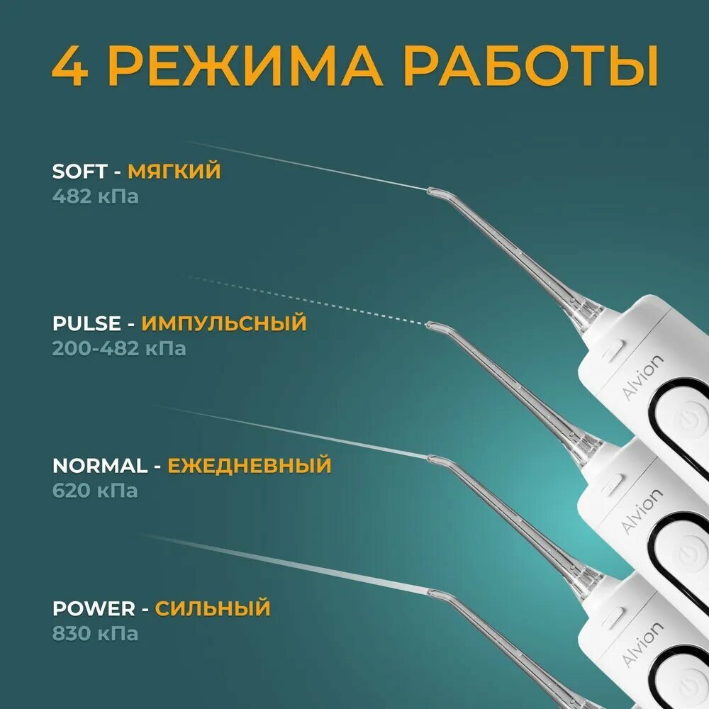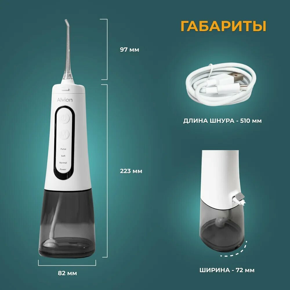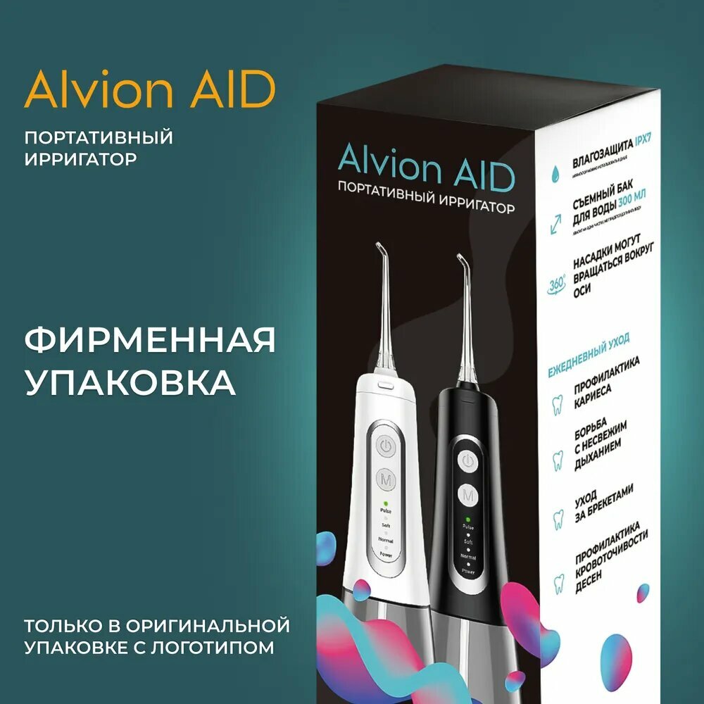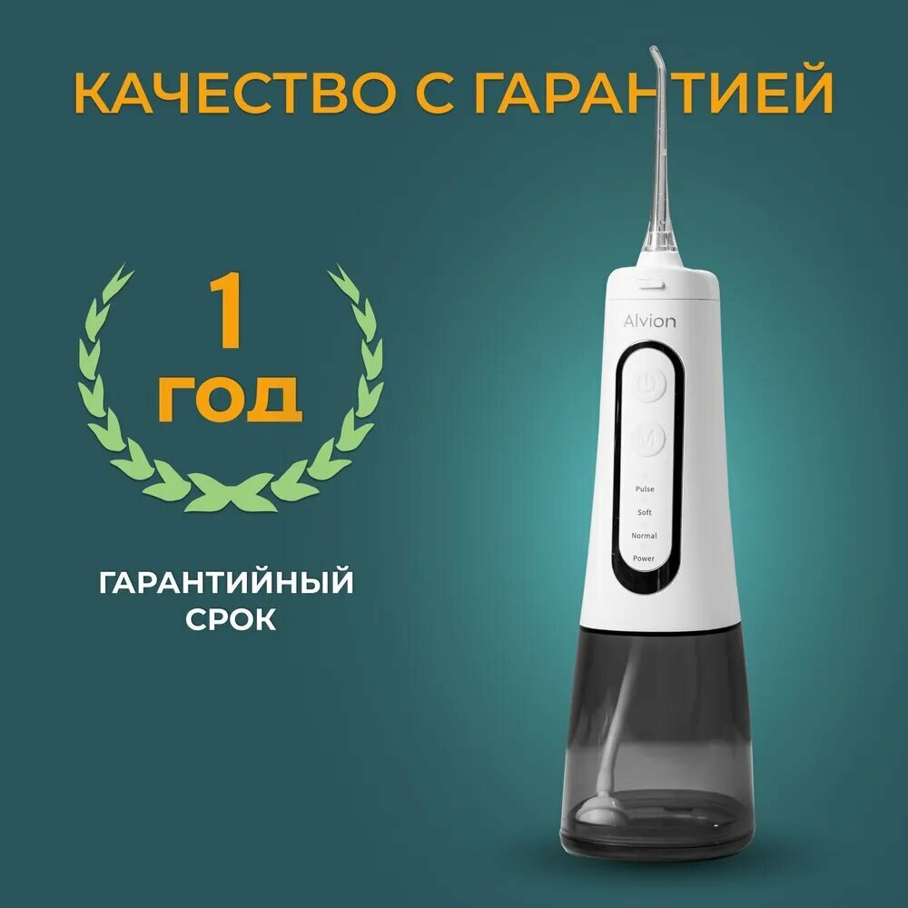 Ирригатор для полости рта портативный с насадками Alvion Aid, беспроводной, 300 мл, 4 режима, IPX7, белый интересное: