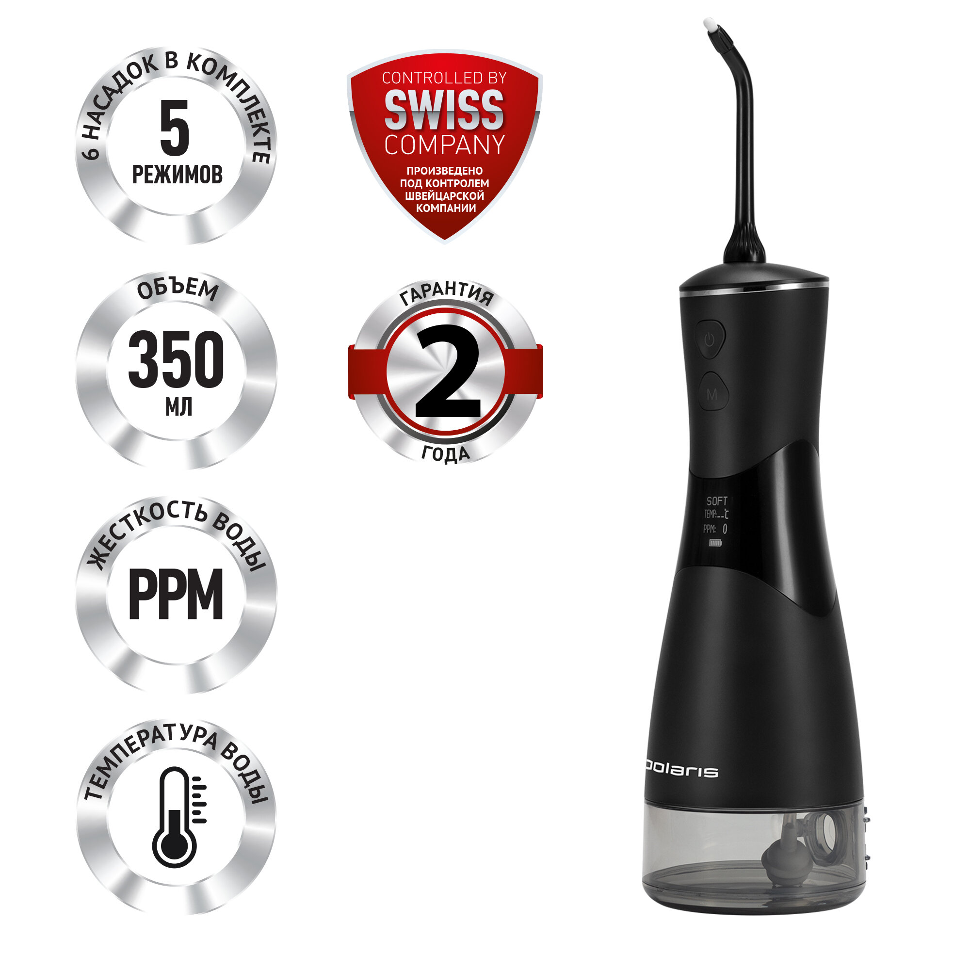 Ирригатор портативный Polaris PWF 0301T Smart Display для полости рта, 6 насадок / Черный