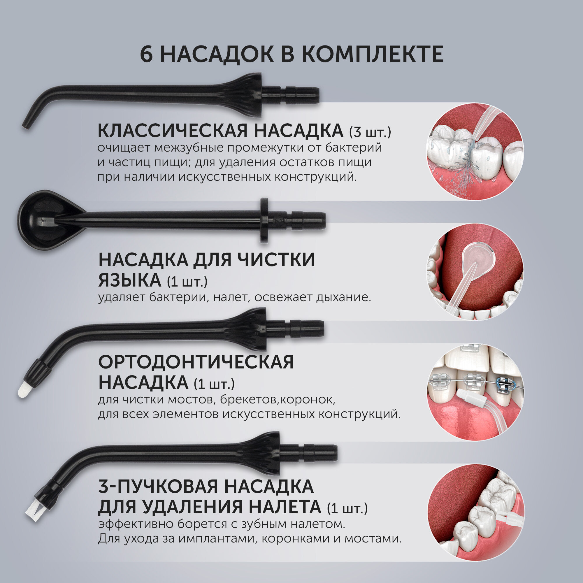 | Насадки | для струйной чистки / для чистки языка / пародонтологическая (для десен) / Для всей поверхности / Для межзубных промежутков / Для удаления зубного камня / Для удаления налета / Для чувствительных зубов |
