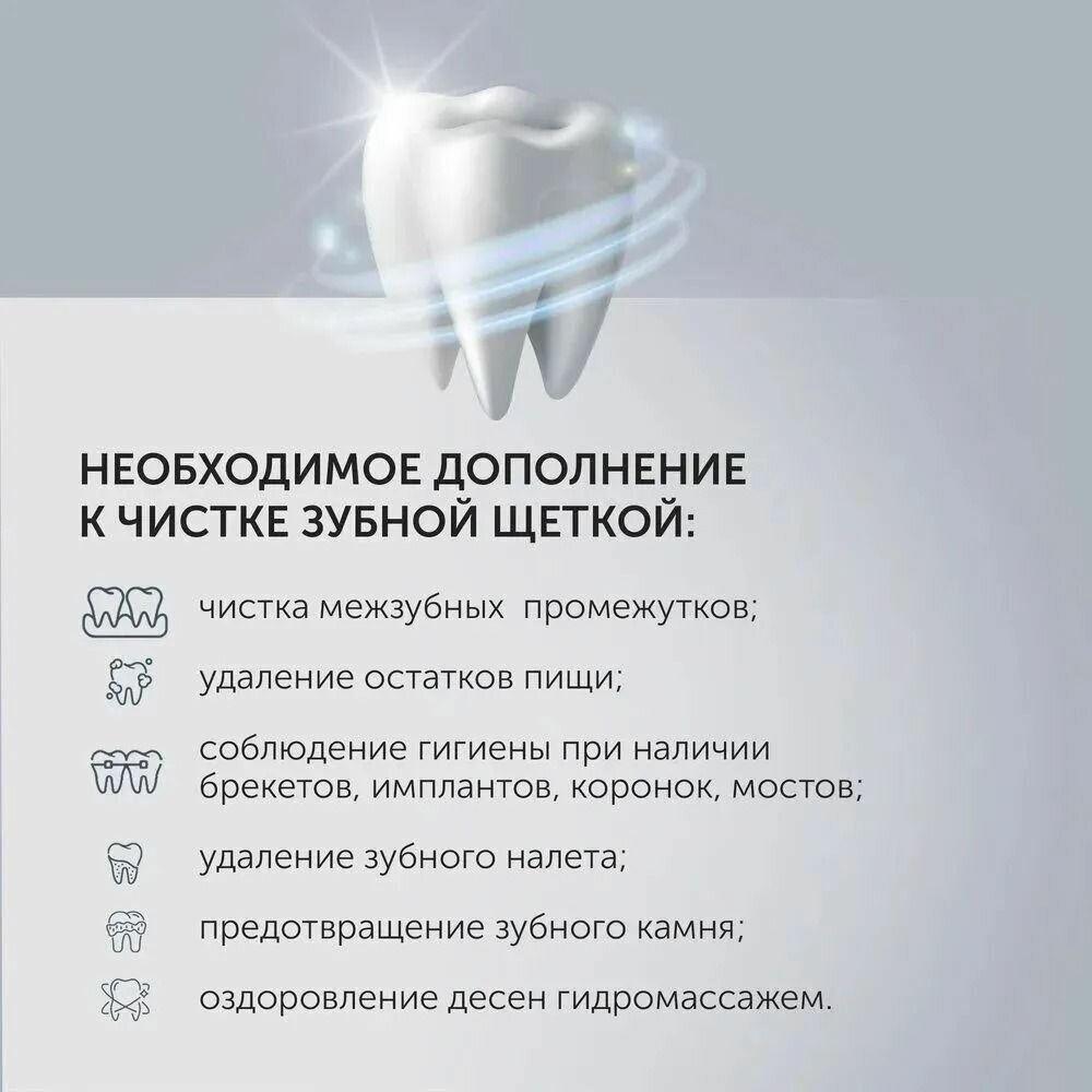 | Насадки | для струйной чистки / для чистки языка / пародонтологическая (для десен) / Для всей поверхности / Для межзубных промежутков / Для удаления зубного камня / Для удаления налета / Для чувствительных зубов |