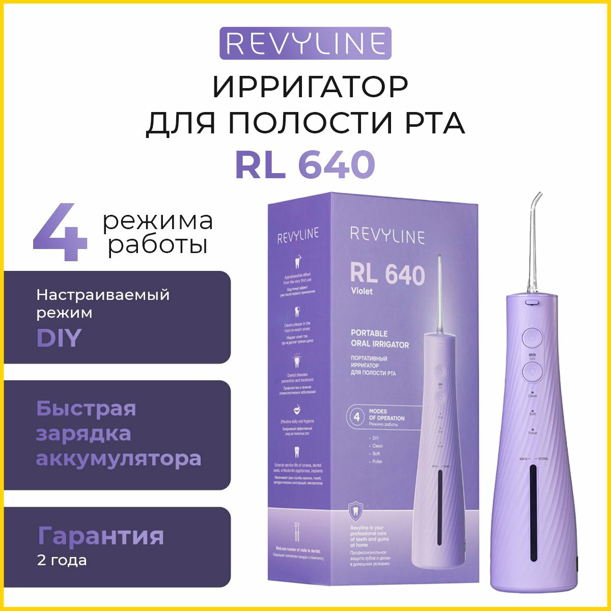 Ирригатор Revyline 640, с регулировкой давления, 4 режима, фиолетовый, 310 мл интересное: