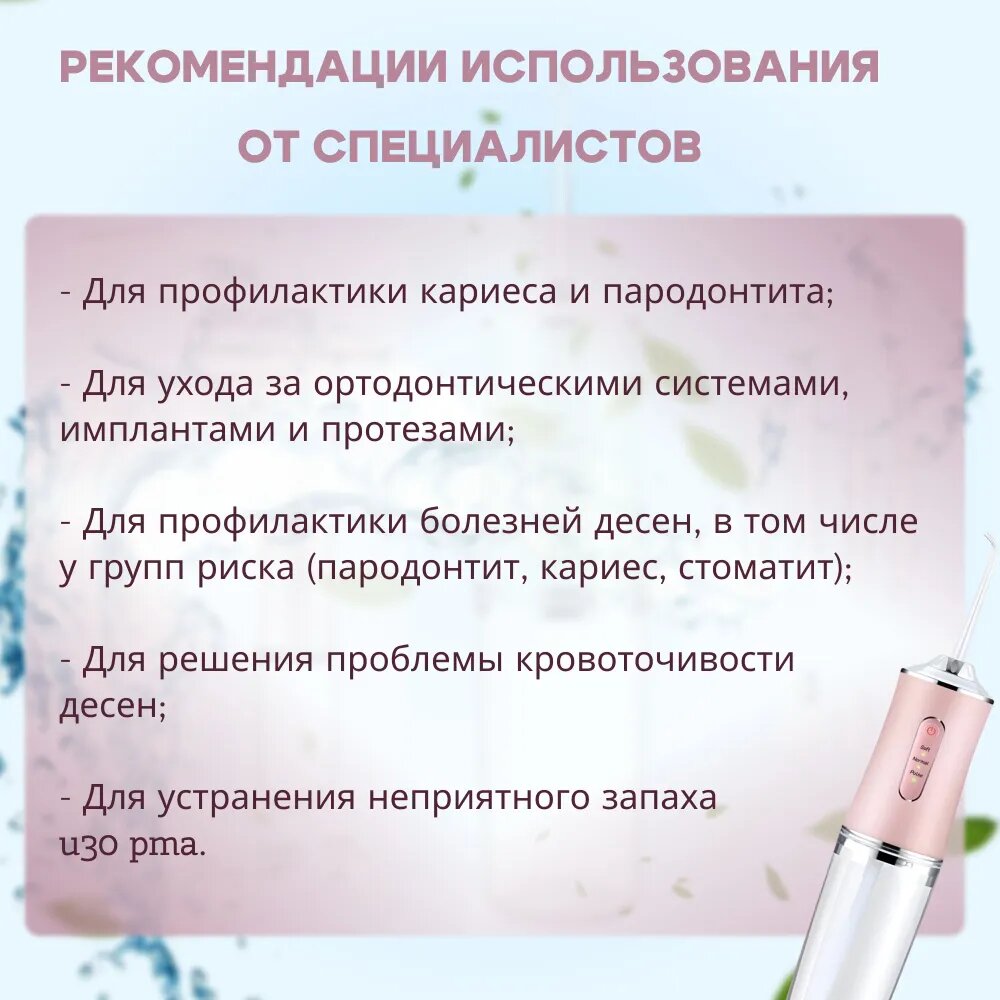 | Дополнительная информация | поток воды под давлением, массаж десен, чистка зубов |