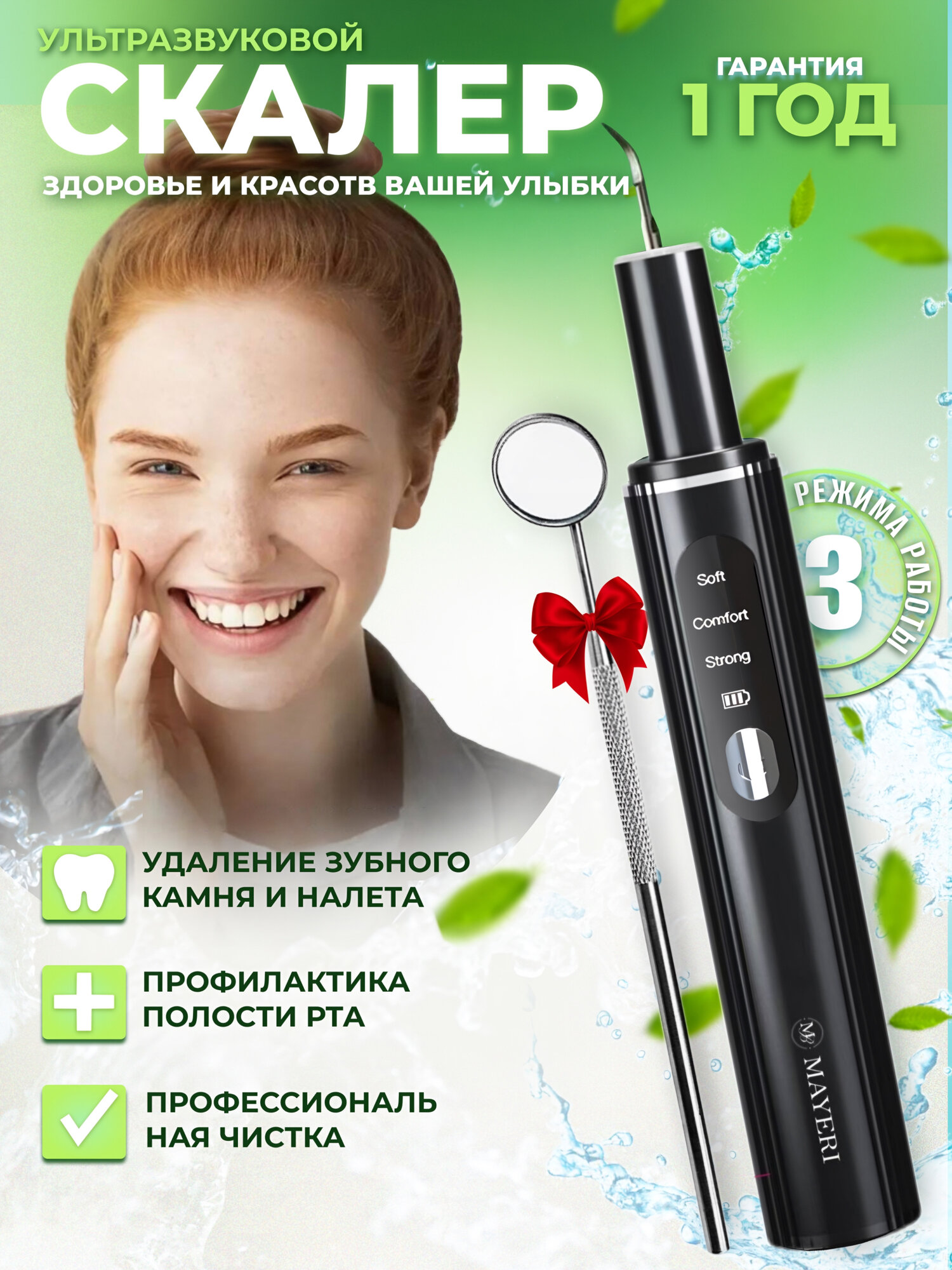 | Подробная комплектация | скалер; ключ; 2 насадки; стоматологическое зеркало; USB-кабель; инструкция |