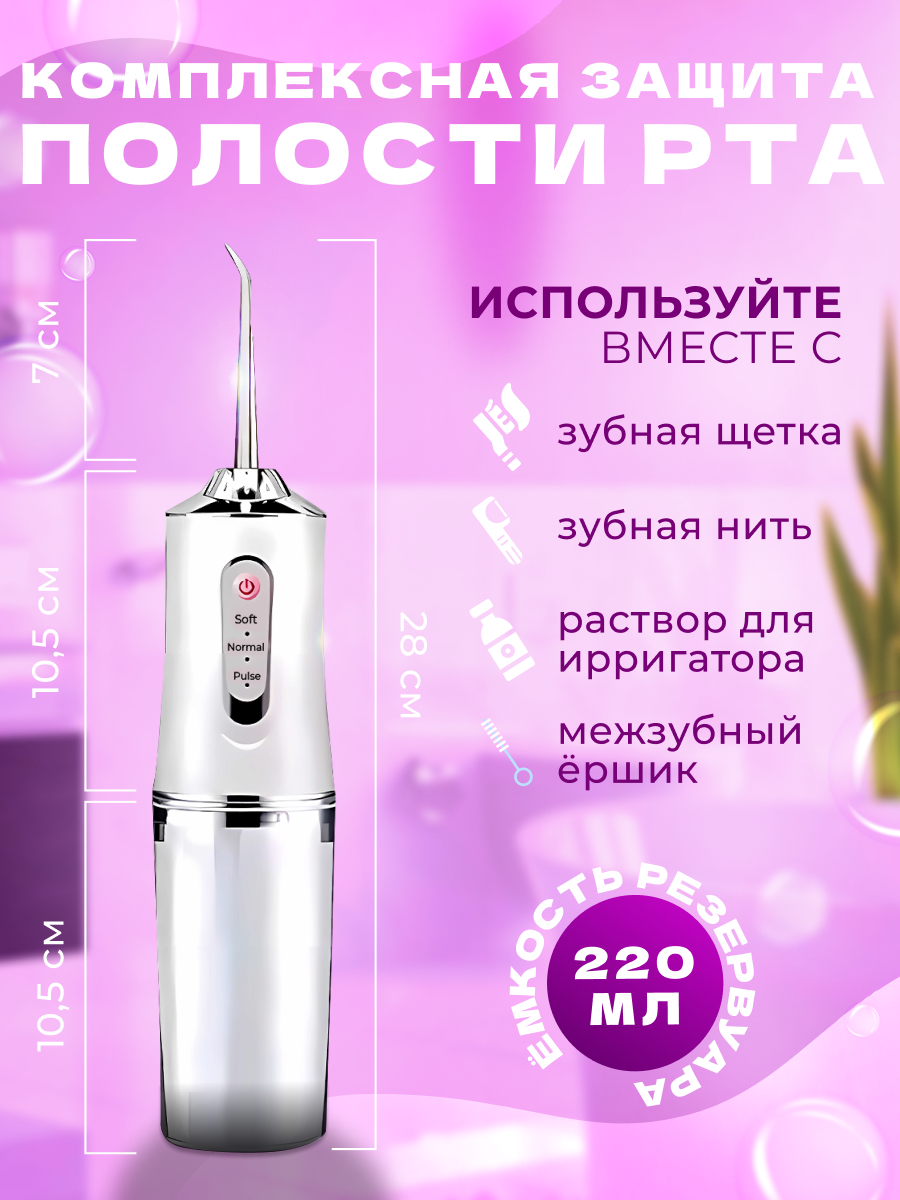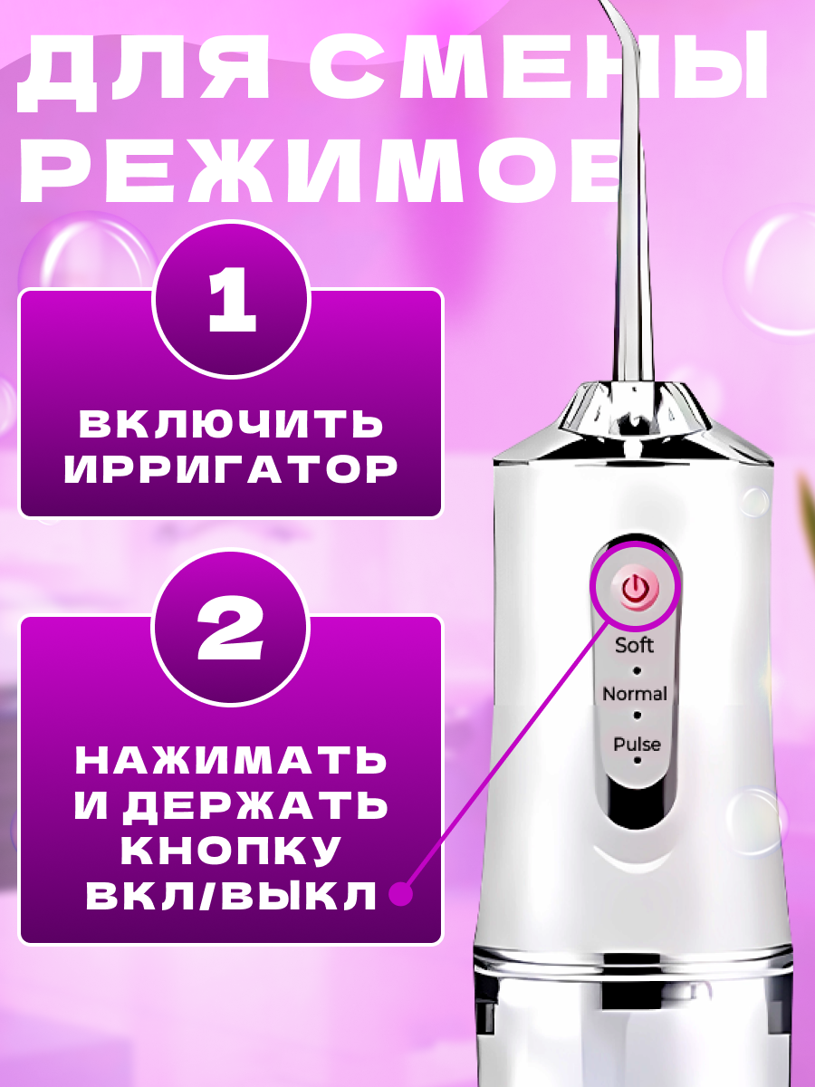 Ирригатор для полости рта портативный белый цвет, 4 насадки, 3 режима