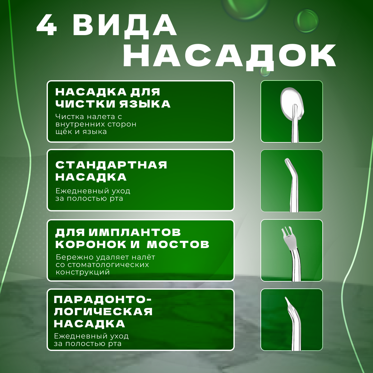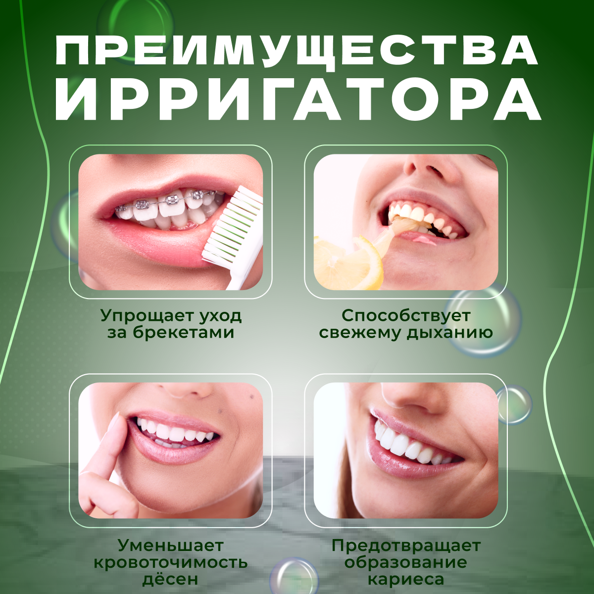 Ирригатор для зубов и полости рта портативный, зеленый цвет, 4 насадки и 3 режима интересное: