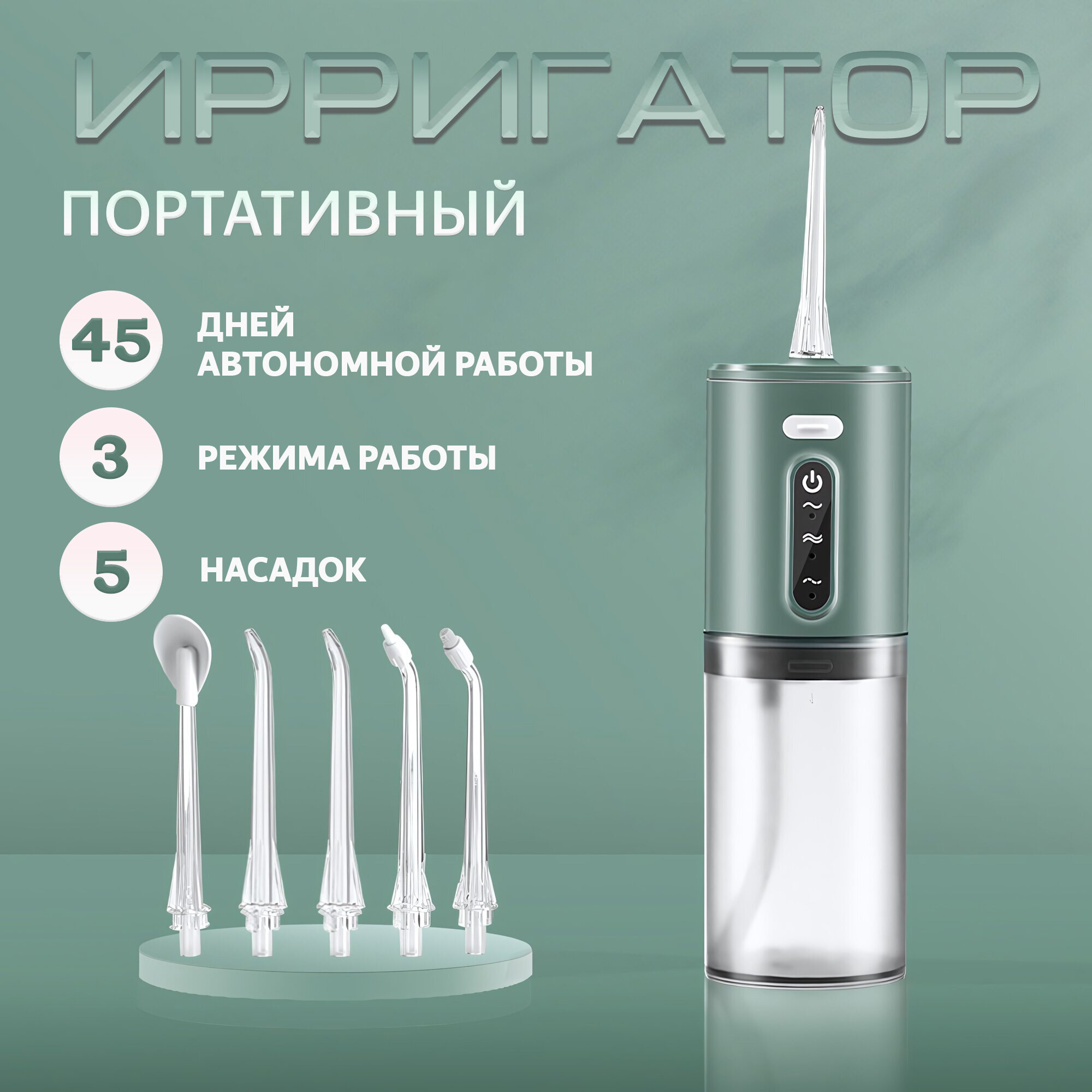Купить Портативный ирригатор Electric Water Flosser, 3 режима работы, 5 насадок, цвет зеленый