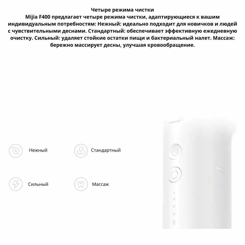 | Подробная комплектация | Ирригатор портативный Mijia Electric Teeth Flosser F400 (MEO704), 3 насадки, чехол для переноски, кабель для зарядки ирригатора, документация на Китайском языке |