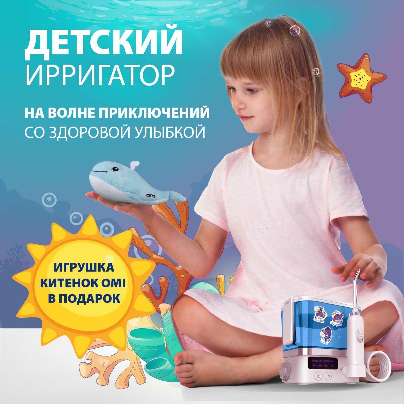 | Подробная комплектация | Ирригатор, usb адаптер, набор стикеров, мягкая игрушка, набор насадок. |