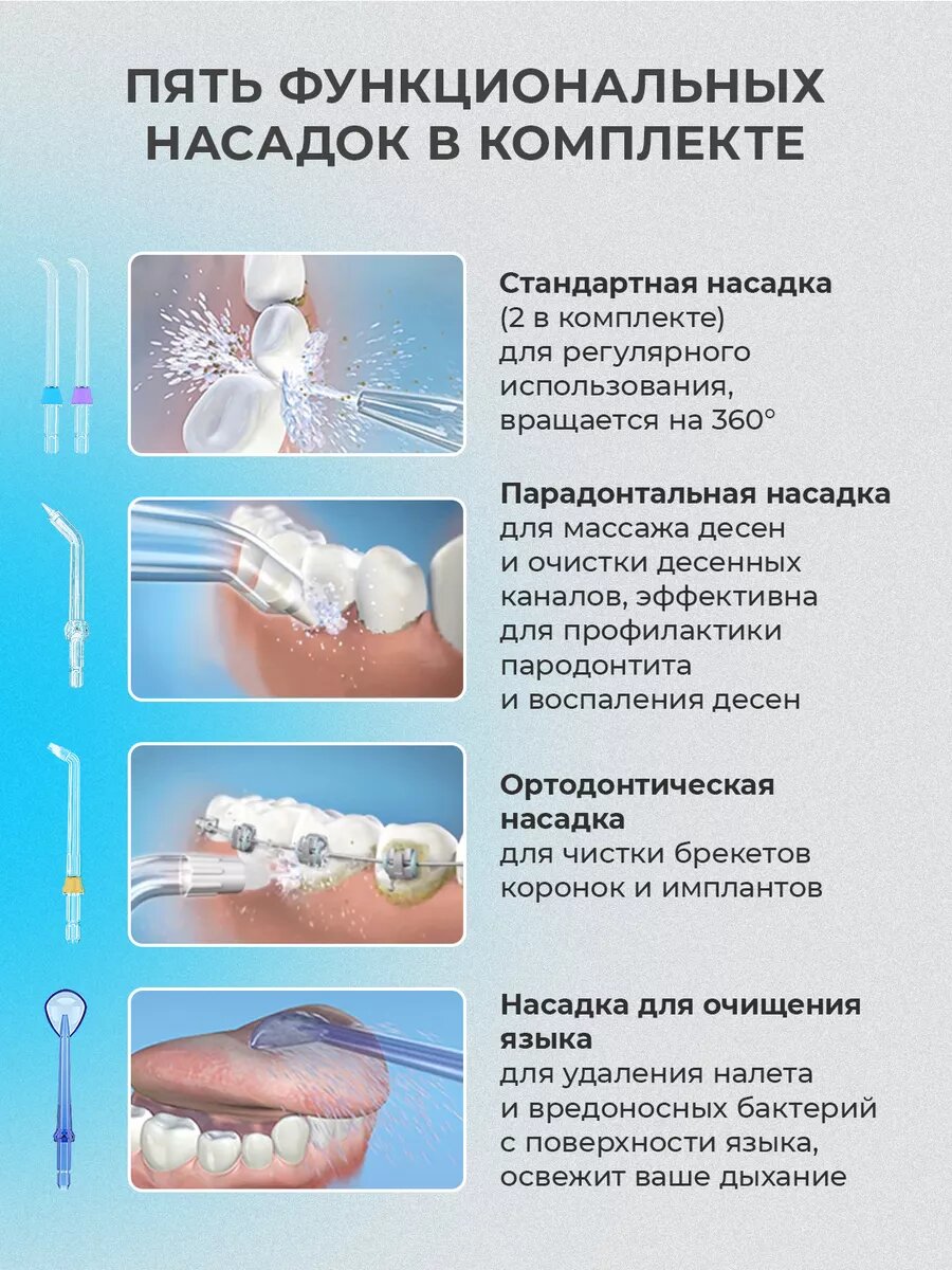 | Дополнительные функции | Для промывки носа / индикатор зарядки / уход за ортодонтическими конструкциями |
