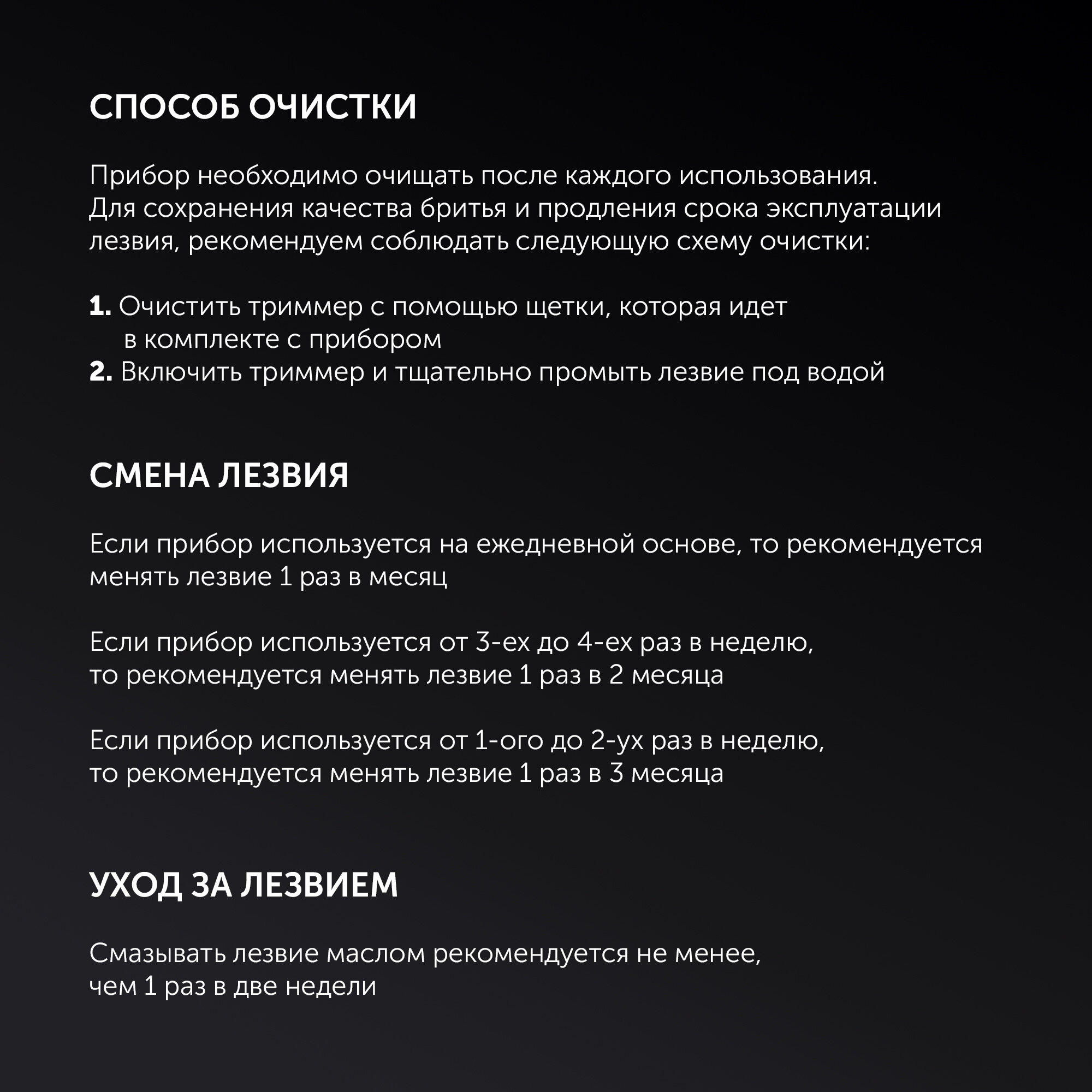 | Особенности | быстрая зарядка / влагозащищенный корпус / Зарядка от USB-порта / Регулируемый нож |