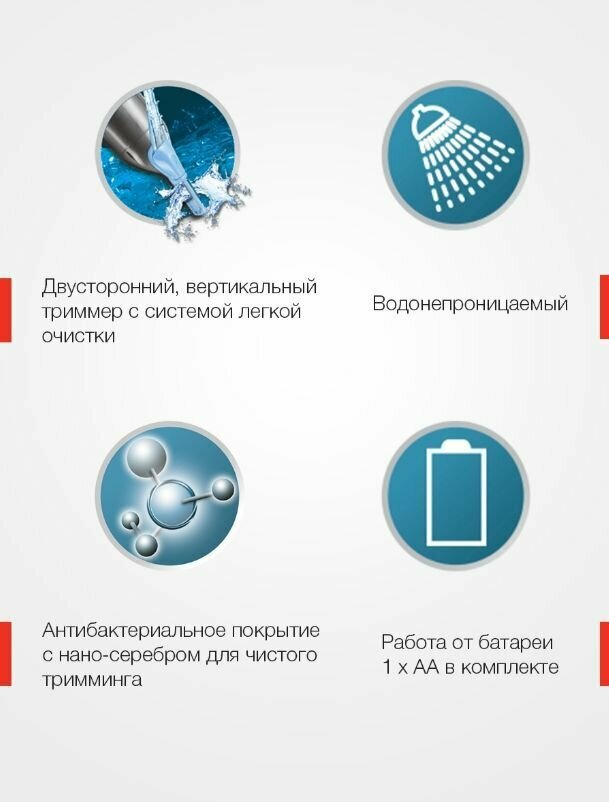 | Дополнительная информация | антибактериальный корпус из наносеребра; петля для подвешивания; технология "Comfort trim"; в комплекте: ножницы, пинцет, пилка и щипцы для ногтей, 2 насадки-гребня, батарейка |