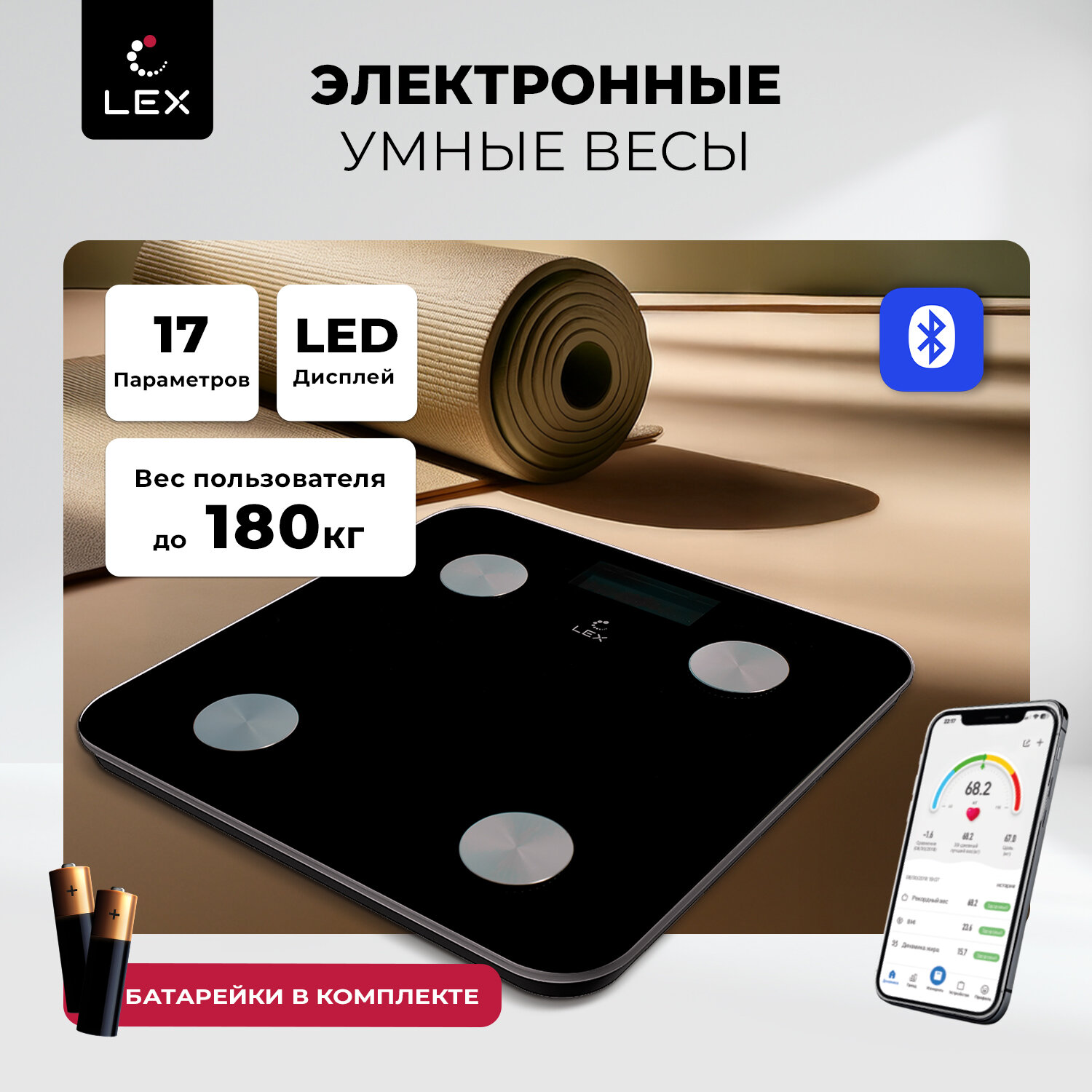 Умные напольные весы LEX LXBS 9002 диагностические, измерение 17 параметров, максимальный вес180 кг. интересное: