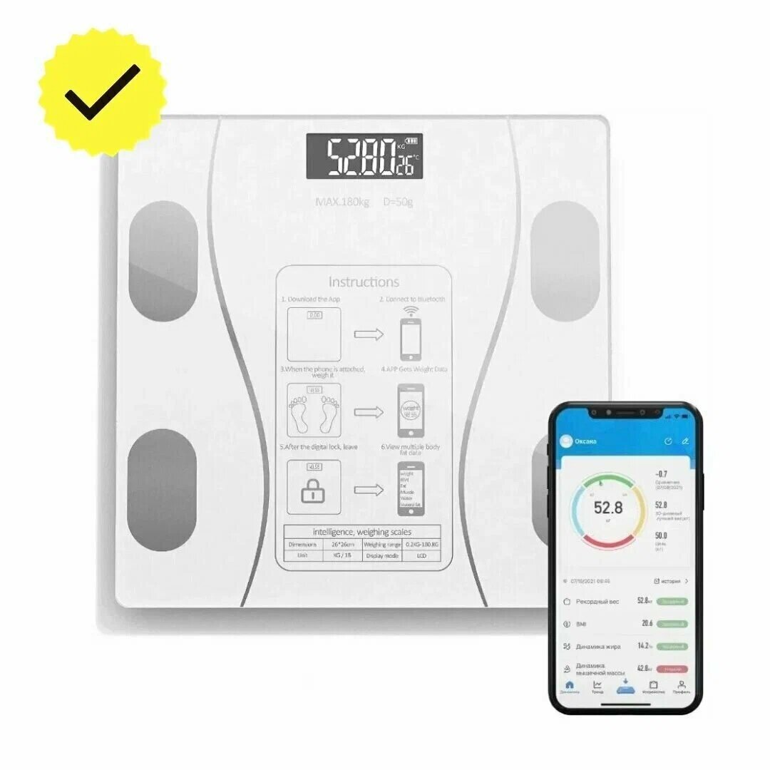 Напольные умные весы, электронные напольные весы c Bluetooth, с функцией измерения биометрии тела, белый, на батарейках интересное: