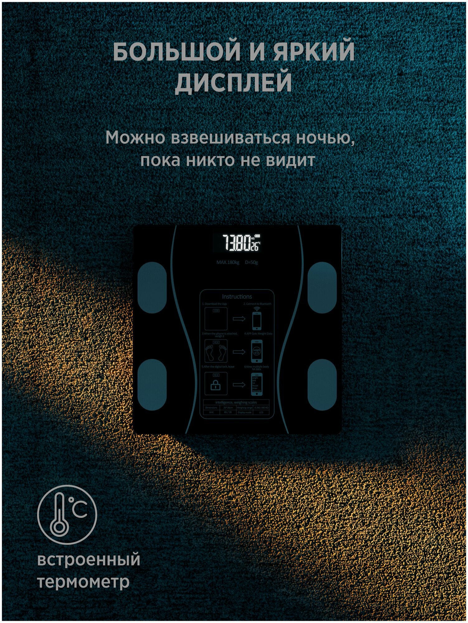 Напольные умные весы, электронные напольные весы c Bluetooth, с функцией измерения биометрии тела, черный, на батарейках интересное:
