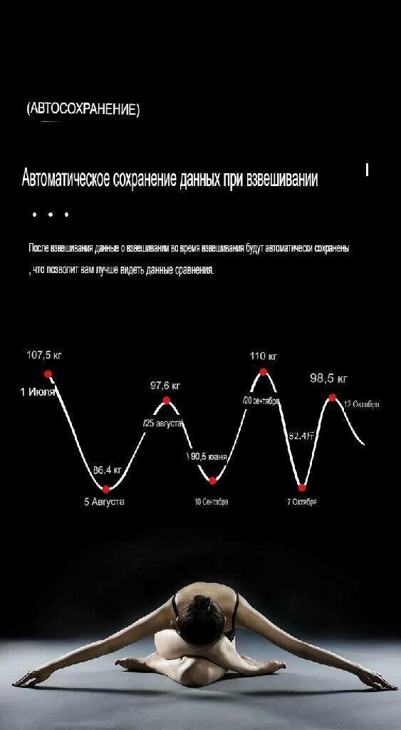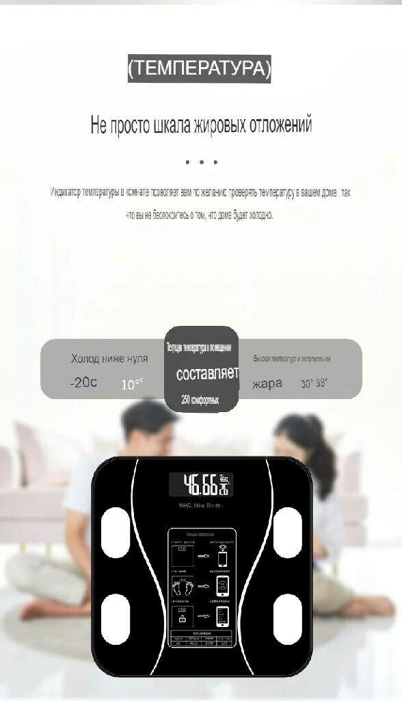 | Дополнительные функции | измерение температуры воздуха / определение доли воды / определение доли жировой ткани / определение доли костной ткани / определение доли мышечной ткани / расчет ИМТ (BMI) |