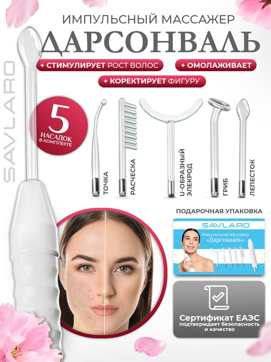 Импульсный массажёр дарсонваль аппарат Savlaro, 5 насадок, для лица, тела и волос, белый интересное:
