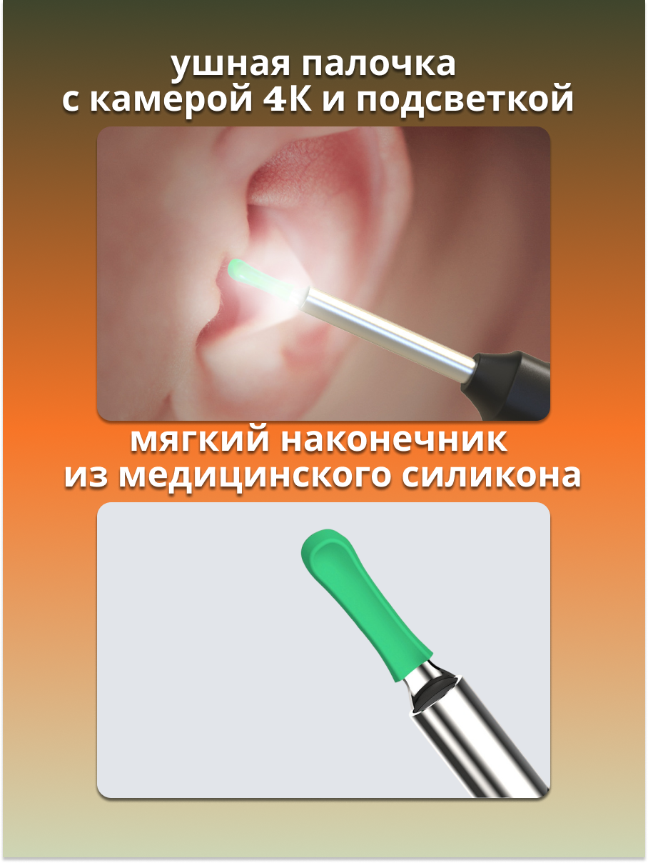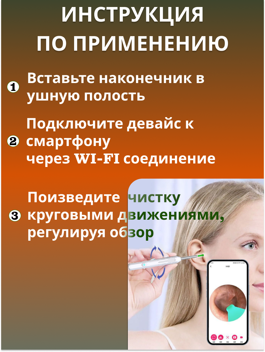 | Комплектация | ушная палочка с камерой и фонариком, кабель для зарядки Type-C, набор сменных силиконовых насадок -12шт в кейсе, набор инструментов для чистки ушей-8шт в кейсе |