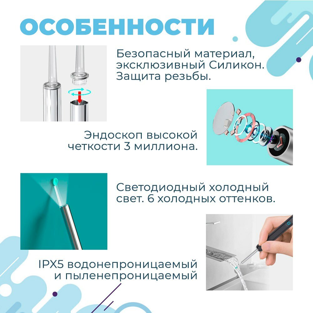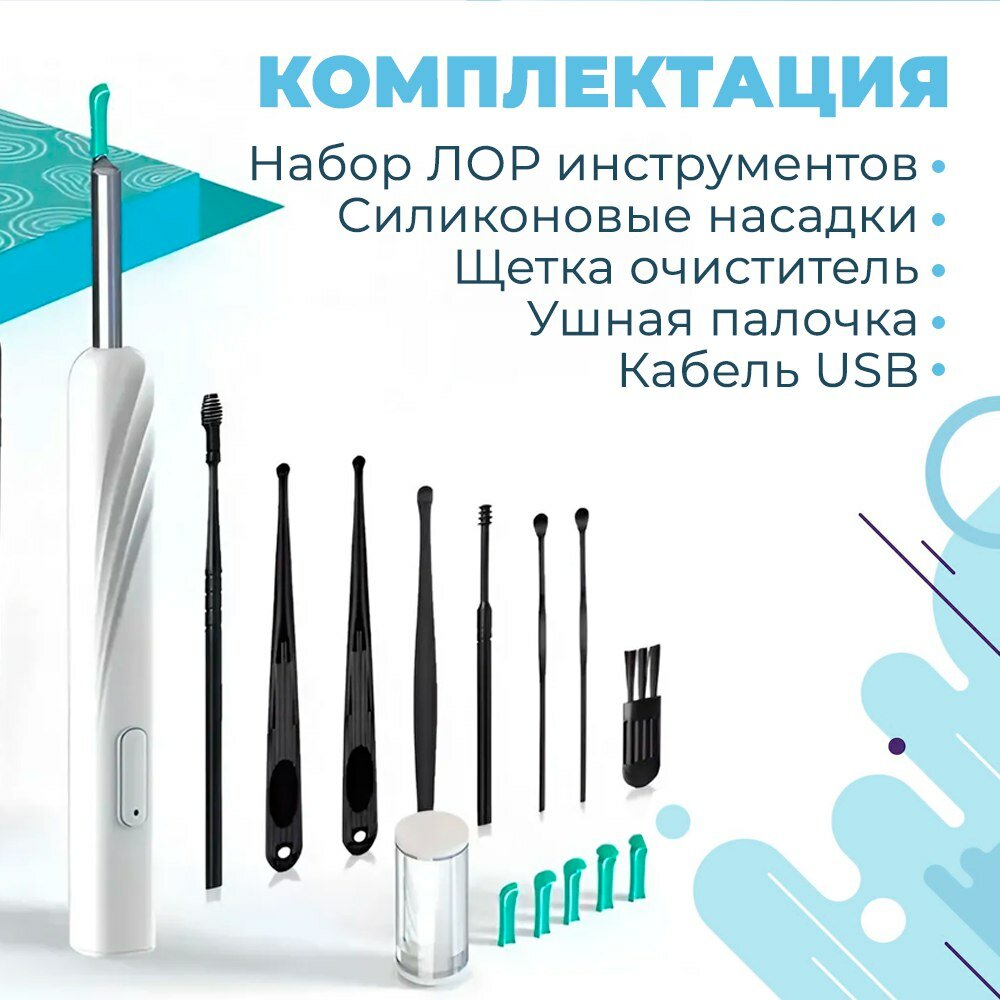 | Комплектация | Ушная палочка Силиконовые насадки Набор ЛОР инструментов Кабель USB Щетка очиститель |
