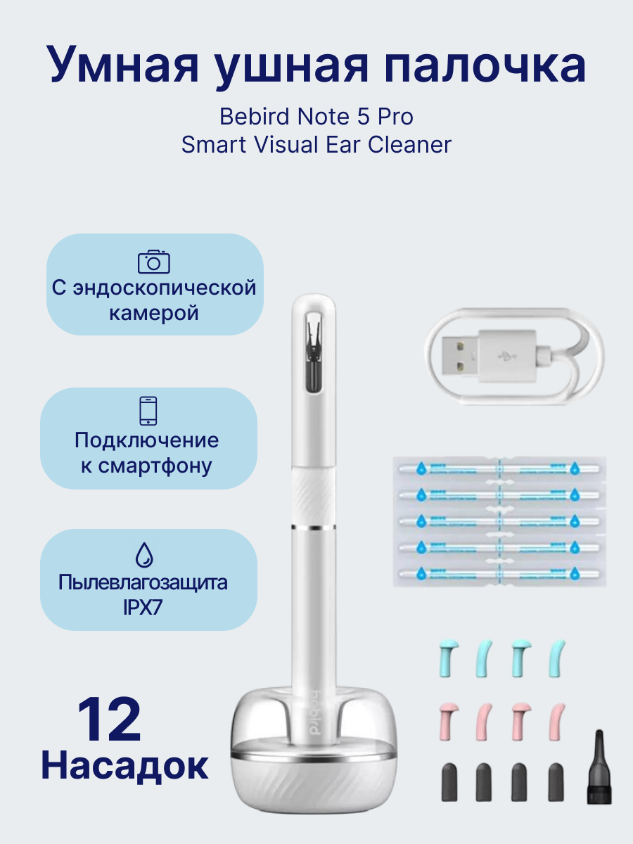 | Комплектация | Умная ушная палочка, база для насадок, комплект насадок, кабель для зарядки, документация |