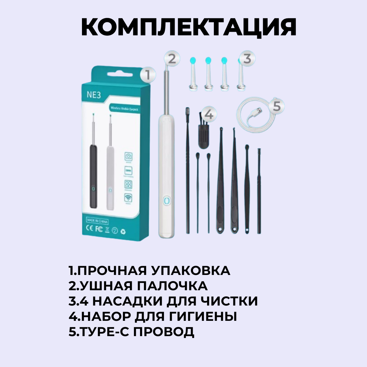 | Комплектация | Прибор - 1шт., запасные лопатки - 4шт., USB провод зарядки - 1шт.,; щетка для чистки инструментов -1 шт., инструменты для ручной чистки ушей - 7 шт. |