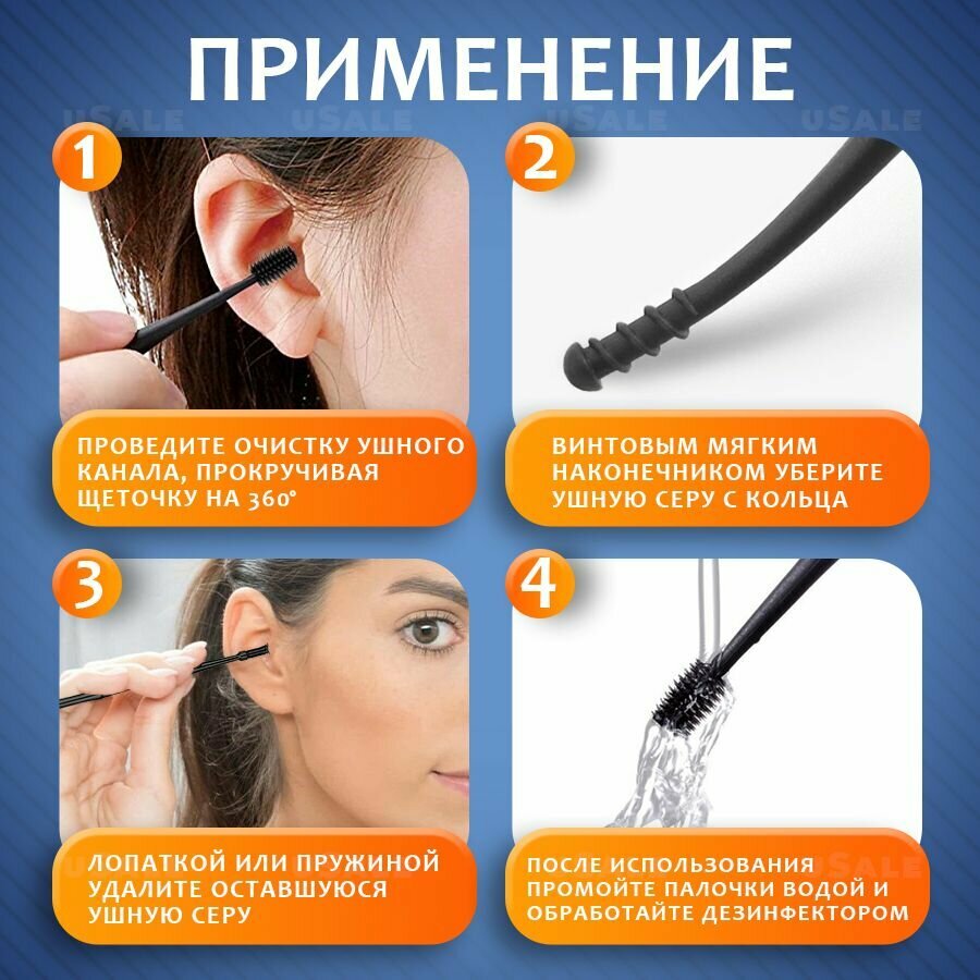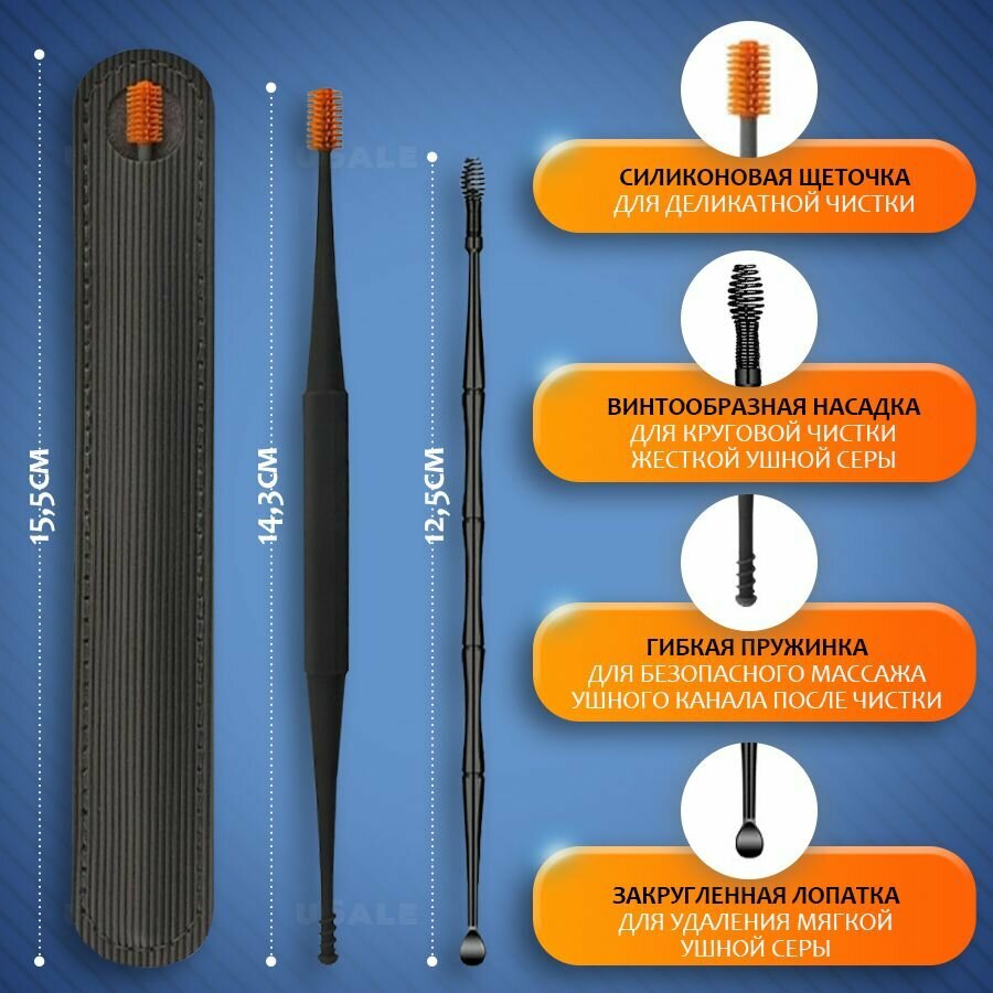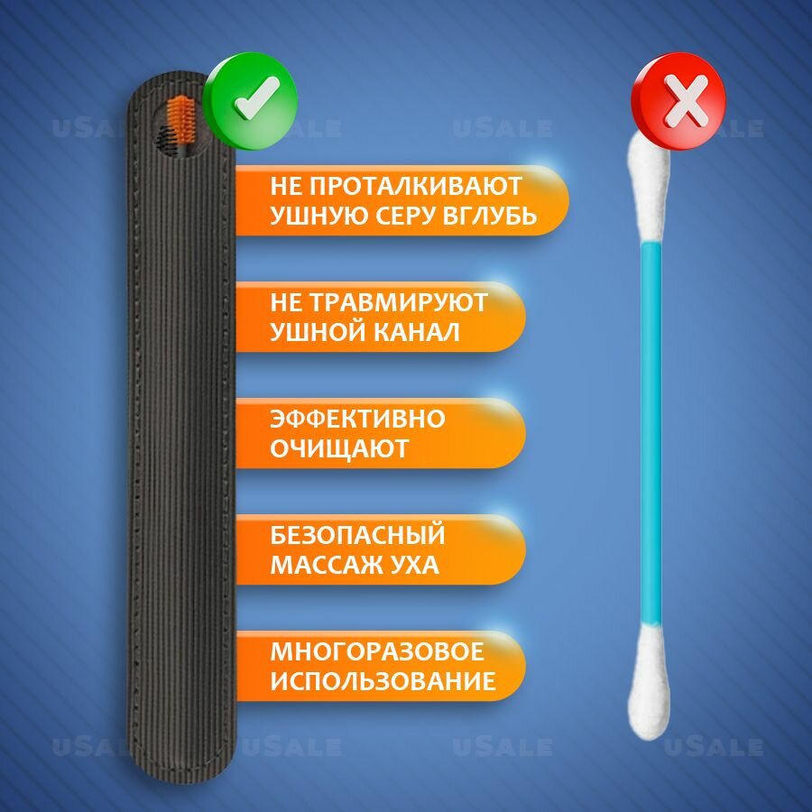 | Комплектация | Индивидуальный чехол, двухсторонняя силиконовая многоразовая щеточка для чистки ушей |