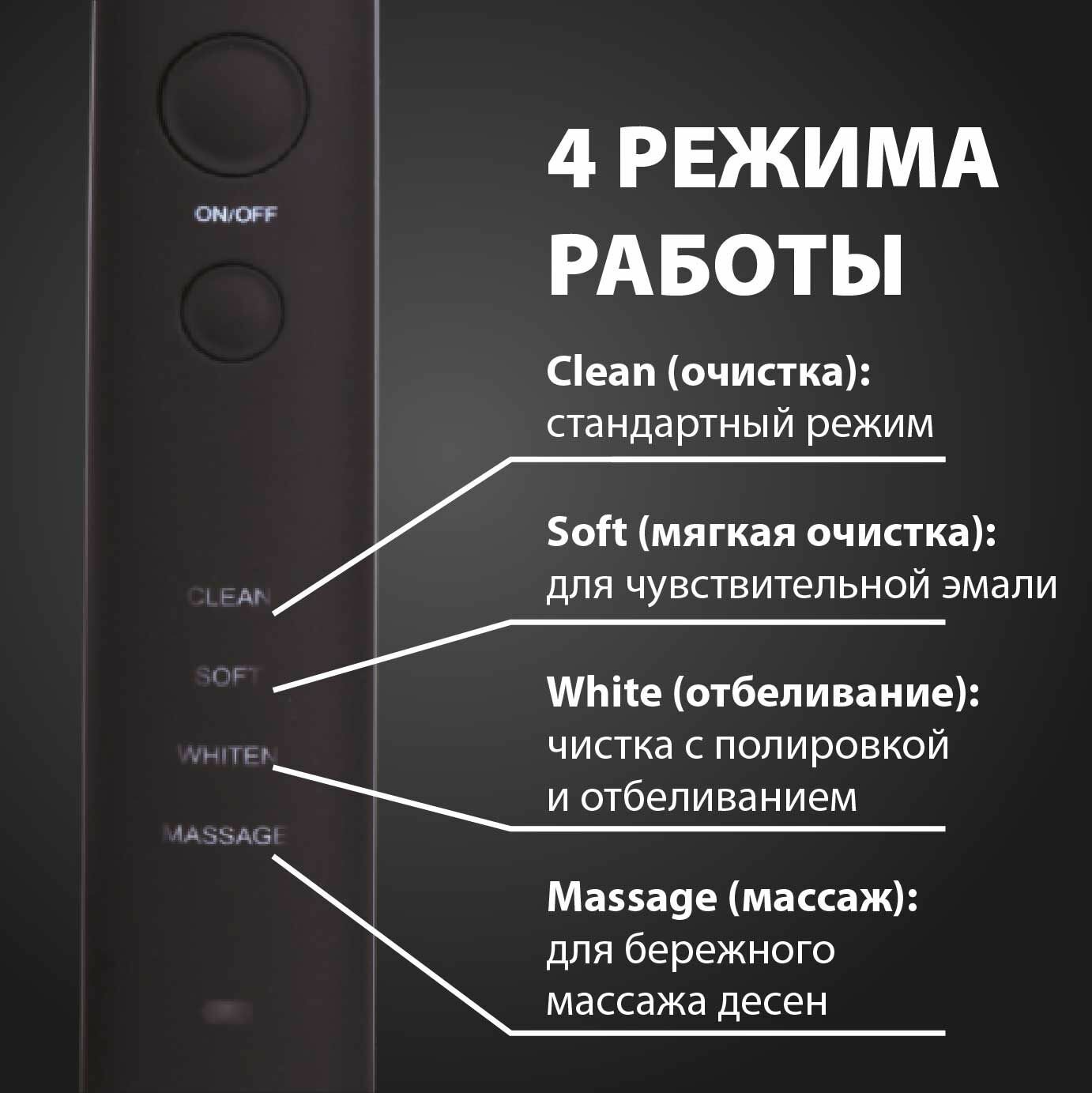 | Режимы работы | деликатная чистка / массаж / отбеливание / Нормальный режим |