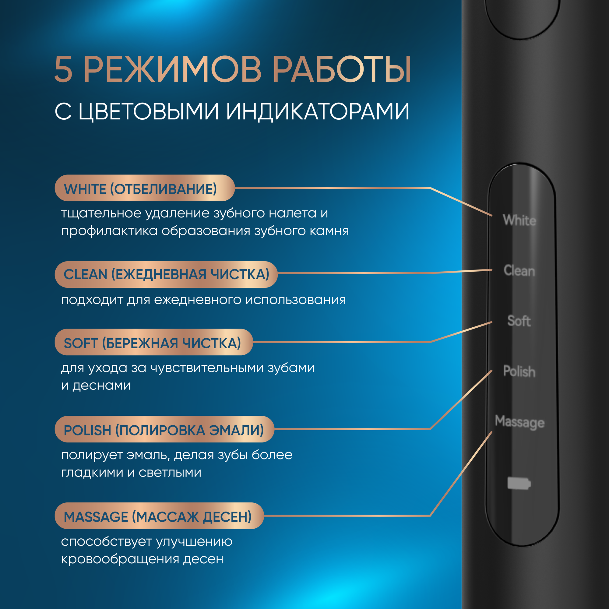 | Режимы работы | деликатная чистка / ежедневная чистка / массаж / отбеливание / полировка |